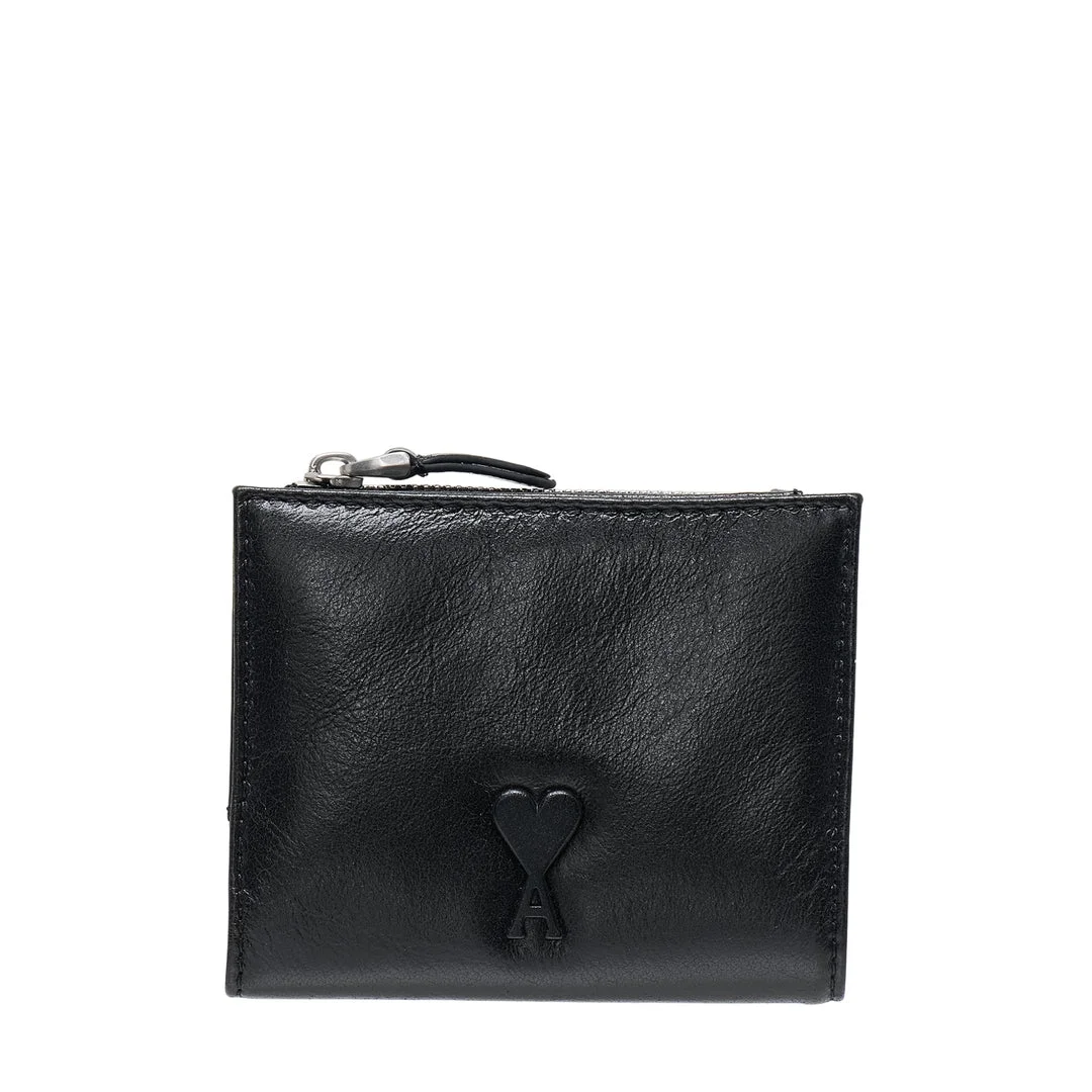 600079334BLK0OS / USL201.AL0052/00/001 - Premium black leather construction - Embossed AMI heart logo - Top zip closure - Compact folded design - Multiple card slots - Bill compartment - Smooth leather finish The AMI Voulez Vous Folded Wallet delivers compact luxury with sophisticated Parisian craftsmanship. Crafted from premium black leather with smooth finish, featuring the signature AMI heart logo embossed on the front. The minimalist design and quality construction create an elegant everyday essential for the modern wardrobe.