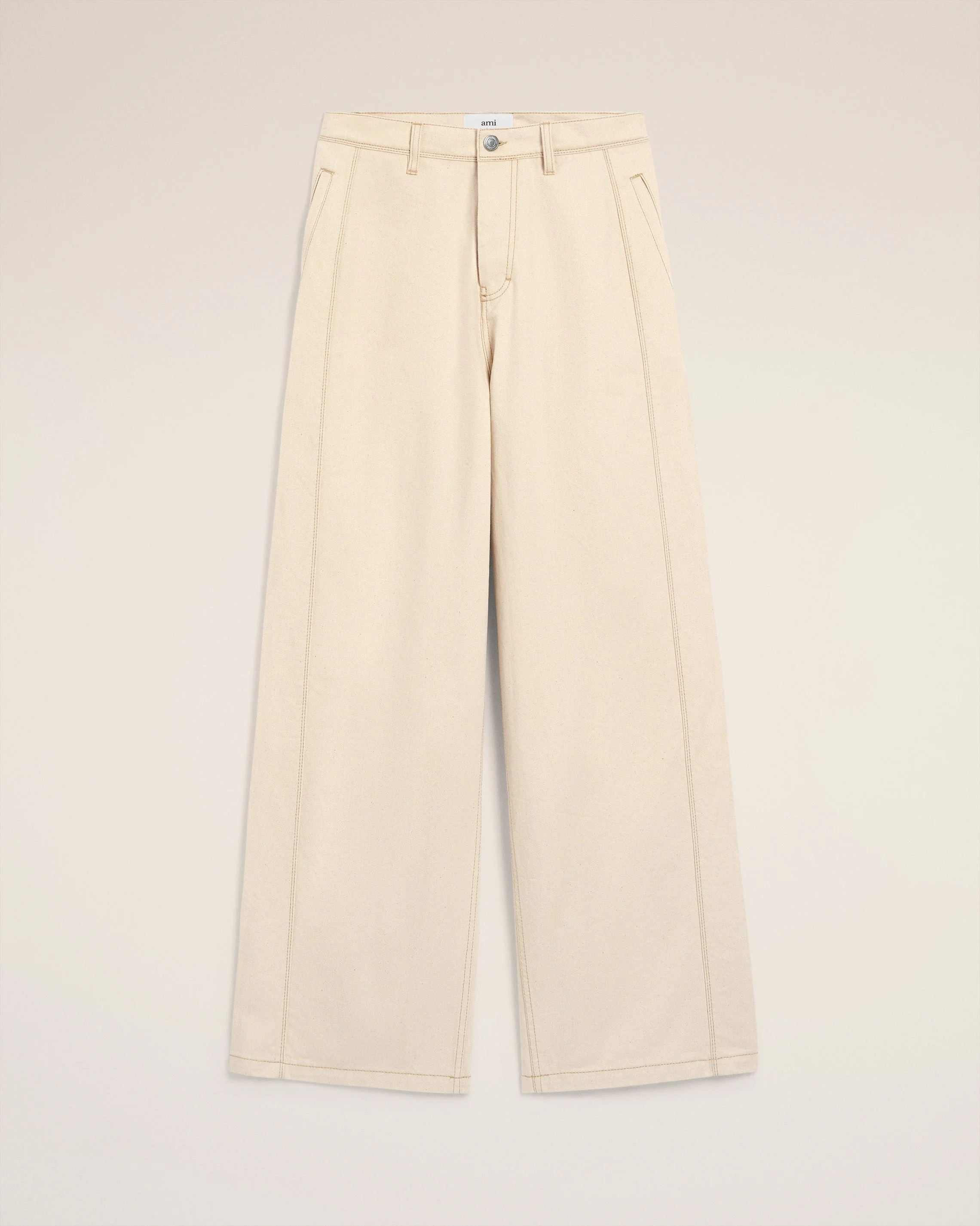 Wide fit jeans in off white cotton twill. Very large fit Classic waist Very large leg Buttoned fly Denim metal rivets and buttons in nickel color 5 pockets "ami alexandre mattiussi" patch on the back Contrasted topstitches 31 cm bottom leg width (size 30) Made in Portugal (with love) REF: HTR820.DE0106.150 SIZE & FIT This item is designed to be worn lose. Take your normal size. Model is 186 cm / 6"1 and is wearing a size 30. COMPOSITION & CARE GUIDE Main Material : 100% Cotton Pocket Lining : 65% Polyester 35% Cotton Machine wash at 30°c Chlorine prohibited Do not tumble dry Medium iron Dry clean possible Wash inside out Wash with similar colours