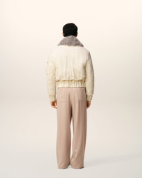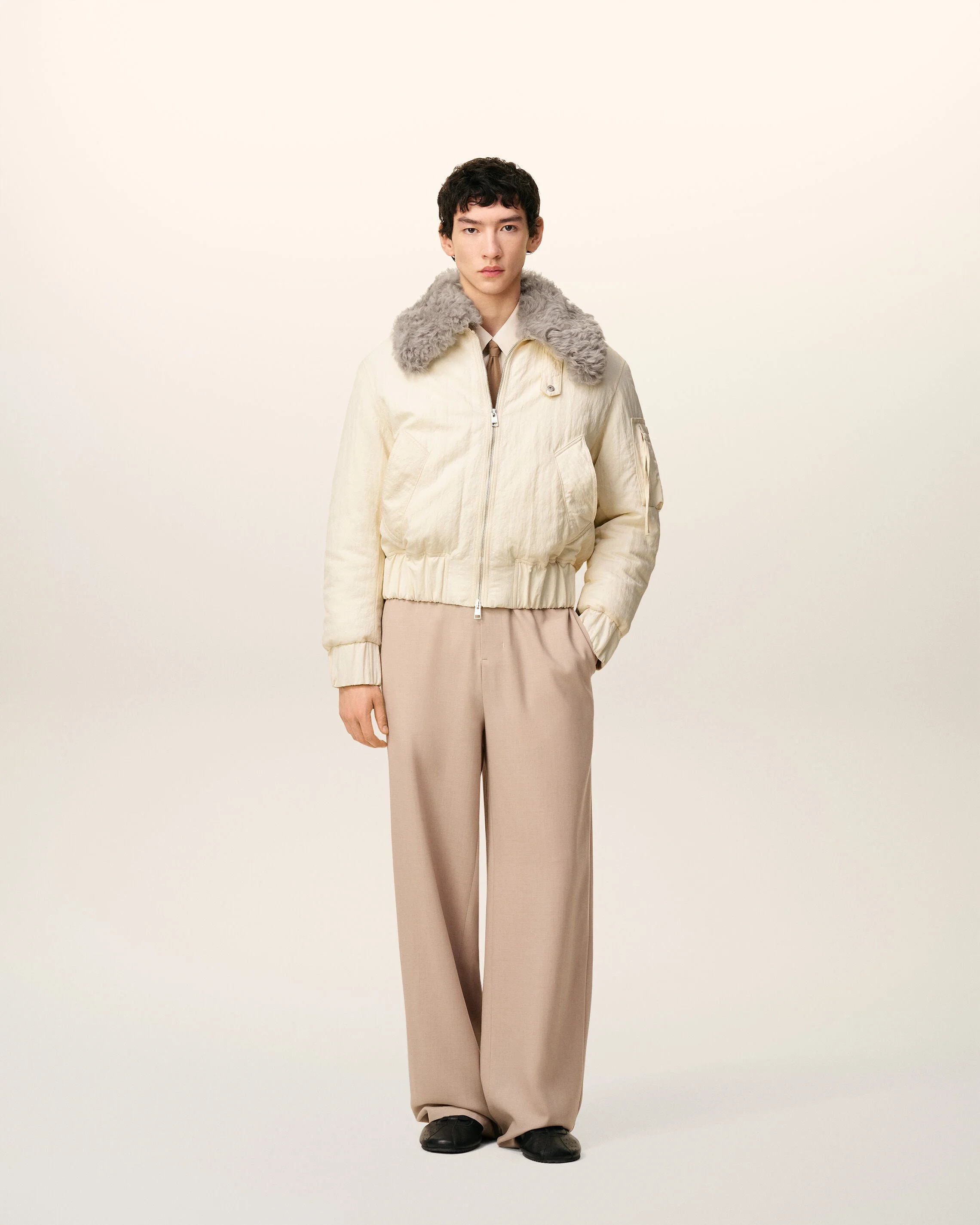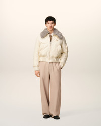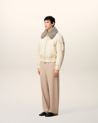 Padded bomber in crinkled nylon serge. Unisex product Removable shearling collar Nickel double metal zipper with "ami" engraved puller Zipped pocket on the sleeve Elasticated cuffs and waist Front and intern pockets with invisible snap buttons "ami alexandre mattiussi" leather label on the sleeve Fully lined and padded Water repellent fabric 57 cm center back length (size XS) 62 cm center back length (size M) Made in Romania (with love) REF: UJK821.PA0035.185 SIZE & FIT This style is unisex. For man, take your normal size. For woman, take one size down than your usual size. Man model is 183 cm / 6"0 and is wearing a size M. Woman model is 177 cm / 5"9 and is wearing a size XS. COMPOSITION & CARE GUIDE Main Material : 100% Polyamide Main Lining : 100% Polyester Collar : 100% Lamb Leather Padding : 100% Polyethylene Pocket Lining : 100% Cotton Do not wash Chlorine prohibited Do not tumble dry Cool iron Dry clean gentle