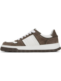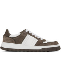 Low-top buffed calfskin and calfskin suede sneakers in white and taupe. · Perforated detailing at toe · Lace-up closure · Logo patch at padded tongue · Padded collar · Logo embossed at sides and heel tab · Logo embossed at padded footbed · Buffed leather lining · Logo embossed at rubber midsole · Treaded rubber sole Supplier color: White/Smoke grey Upper: calfskin. Sole: rubber. Made in Portugal 251482M237000