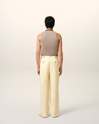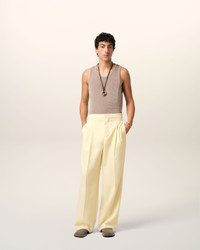 Large fit trousers in light wool canvas. Wide fit 28 cm bottom leg width (size 40) Front lining to knees Front pleats Buttoned fly "ami" waistband V detail on the back Buttoned back pockets Buttoned adjustable tabs on side Horn buttons Made in Romania (with love) REF: HTR429.WV0068.726 SIZE & FIT This item is designed to be worn lose. Take your normal size. Model is 1m87 / 6'2" and is wearing a size 40. COMPOSITION & CARE GUIDE 100% New Wool Do not wash Chlorine prohibited Do not tumble dry Cool iron Dry clean petroleum solvent only on a gentle process