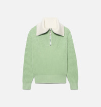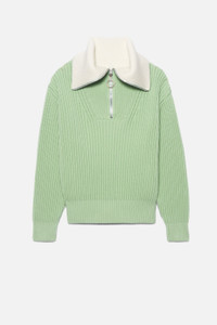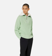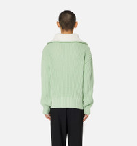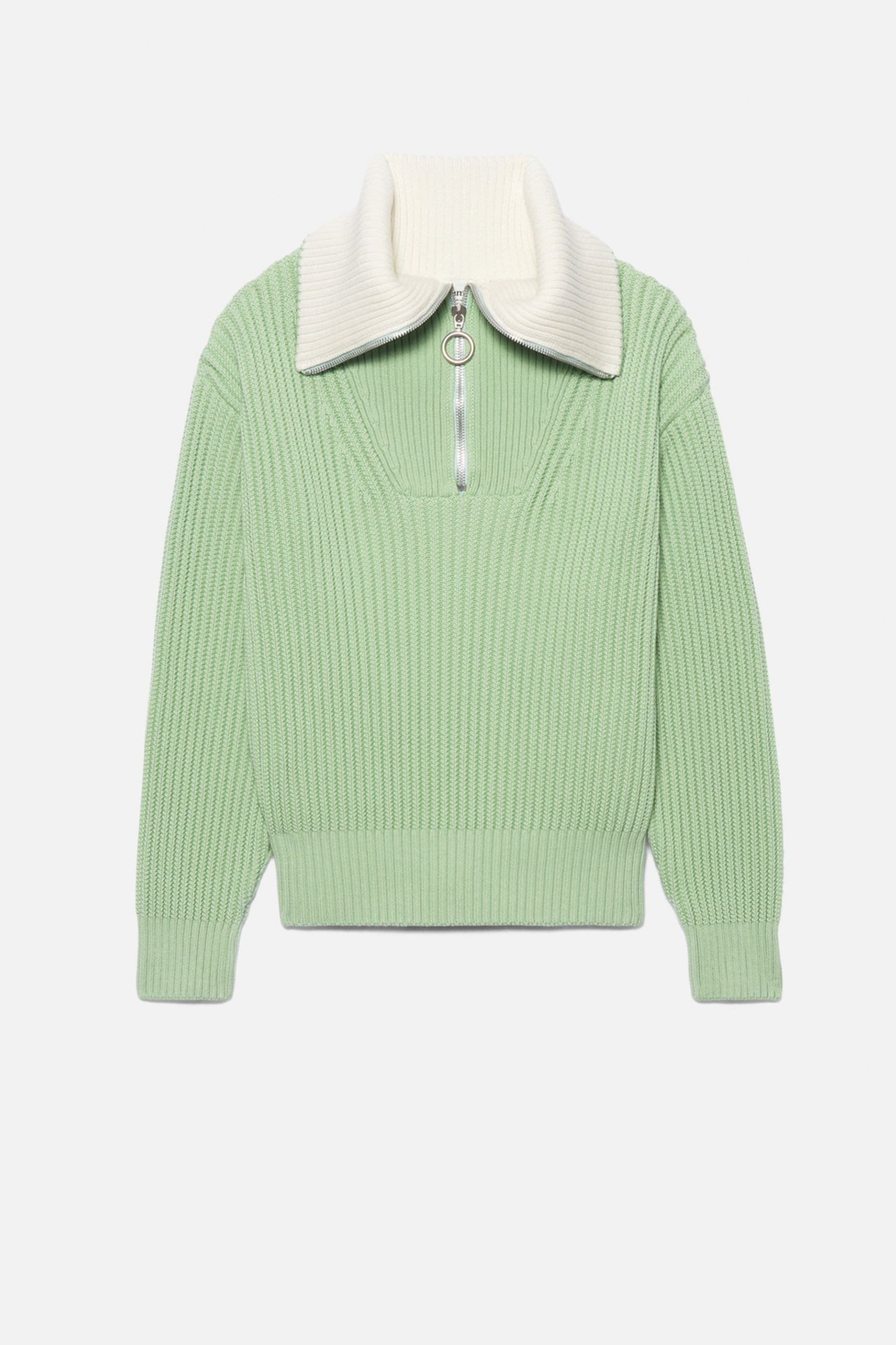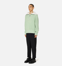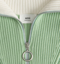 Product Description Aqua green/white organic cotton-wool blend zip-collar fisherman's rib jumper from AMI Paris featuring ribbed knit, spread collar, short front zip fastening, drop shoulder and long sleeves. POSITIVELY CONSCIOUS: This Planet Conscious product is made from at least 50% organic materials, which helps you support organic farming practices such as the restricted use of synthetic chemicals and genetically modified seeds, improved soil fertility and better livestock management.. Zipped-rollneck sweater in organic cotton and wool blend. - Boxy fit - Fisherman's rib knit stitch - 61 cm center back length (M size) - Inside of collar contrasted in white - RWS certified product* Nickel color metal zipper simple slider - Round puller ami engraved - GOTS certified product 85% Cotton (organic) 15% Wool REF HKS600.016444 Size & Fit Fits true to size. Take your normal size. Model wears size M. Chest: 87cm/34.2” Hip: 88cm/34.6” Waist: 72cm/28.3” Shoe: 43 UE Height: 1.85m / 6’ Materials & Care Instructions Hand wash low temperature Do not bleach Do not tumble dry Cool iron Dry clean gentle