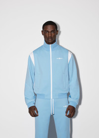 ALWAYS ON POINT TRACK JACKET IN BLUE MADE IN ITALY COTTON MODEL HEIGHT 6' 2", 28" WAIST, 34" INSEAM AND IS WEARING SIZE US MEDIUM DETAILS & CARE 100% POLYESTER DRY CLEAN RECOMMENDED