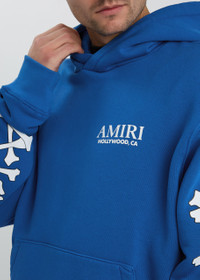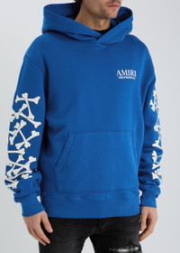 Info & Care Amiri cotton sweatshirt; Hood, dropped shoulders, bones printed sleeves, logo print, pouch pocket, designer plaque at back, ribbed trims Slips on; 100% cotton; Dry clean; Size & Fit Length shoulder to hem: 29.5 inches/ 75cm Midweight; Relaxed fit; Model is 6'1"/ 185cm, chest size 38 inches and wears a size medium;