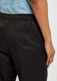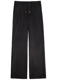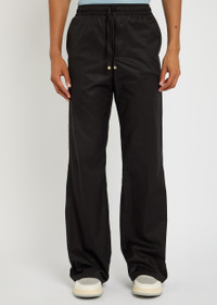 Info & Care Amiri cotton-poplin trousers Elasticated drawstring waist, faux fly, side slip pockets, pressed crease through legs, logo embroidery at back, two slit pockets at back Pull on 100% cotton; lining: 52% viscose, 48% acetate Dry clean Size & Fit Inside leg length: 32 inches/ 81cm Midweight Straight-leg cut Model is 6'1"/ 185cm and wears a size medium