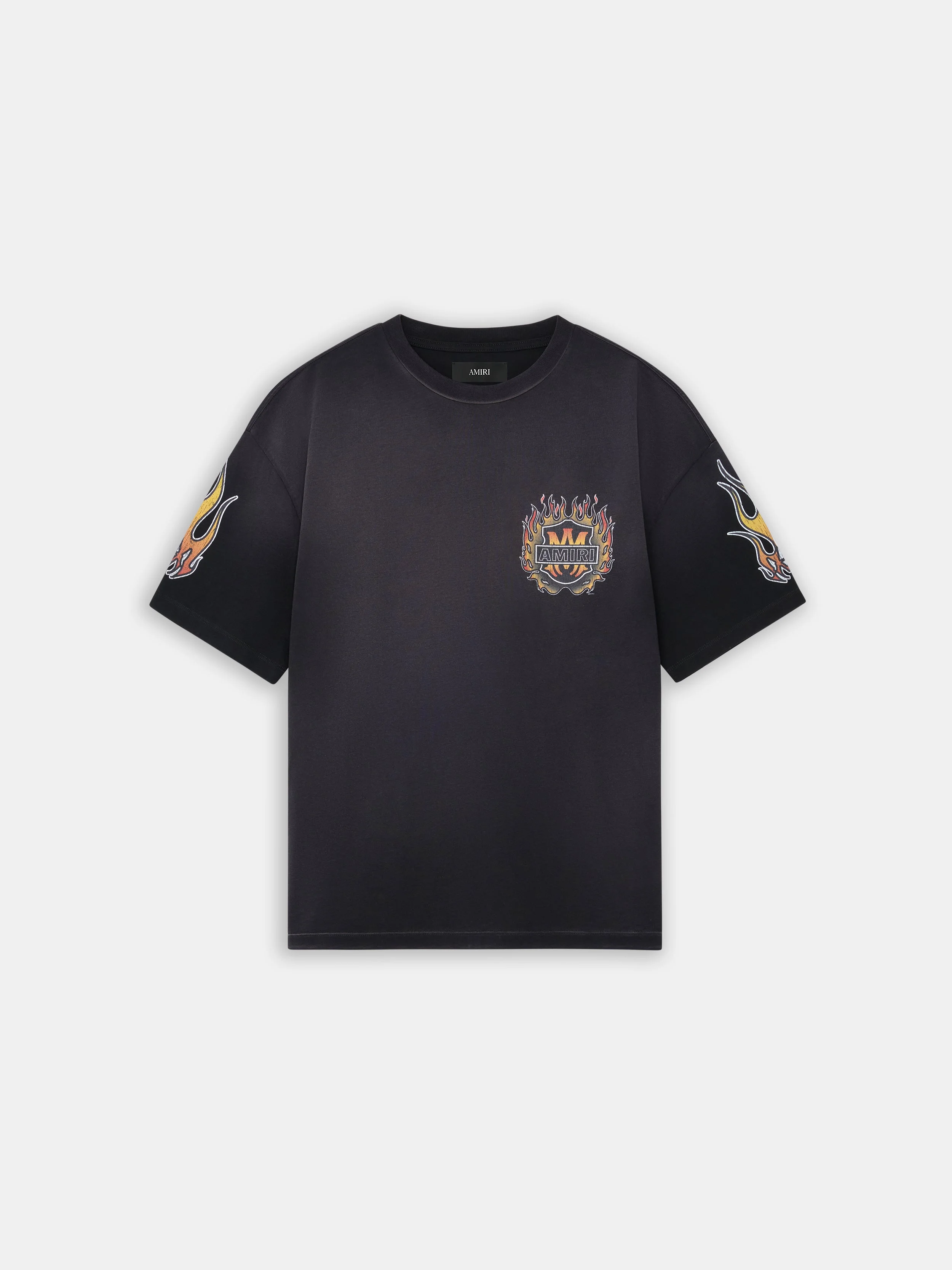 PRE-SPRING 2026 HONORS THE HOUSE'S ORIGINS IN L.A.'S RENEGADE SCENE WITH DISTRESSED MOTORCYCLE GRAPHICS REMINISCENT OF PAST ERAS. THE MA FLAMES OVERSIZED TEE IN COTTON IS TREATED FOR A SUN-FADED EFFECT AND ILLUSTRATED WITH A SEASONAL LOGO GRAPHIC ON THE FRONT, BACK, AND SLEEVES. PRE-SPRING 2026 COLLECTION MADE IN ITALY 100% COTTON THIS GARMENT HAS UNDERGONE A SPECIAL PROCESS WHICH RESULTS IN INTENTIONAL VARIATIONS OF SHADING AND COLOR, AND ADD TO THE PIECE'S UNIQUE CHARACTERISTICS. THIS MAY LEAD TO BLEEDING OR DYE TRANSFER. PLEASE USE CAUTION WHEN WASHING OR DRY-CLEANING THIS ITEM STYLE:AMTOJR1111-001 SIZE & FIT PRODUCT MEASUREMENTS (SIZE M): CHEST: 23.5" SHOULDER: 24" LENGTH: 29" SLEEVE LENGTH: 9.5"