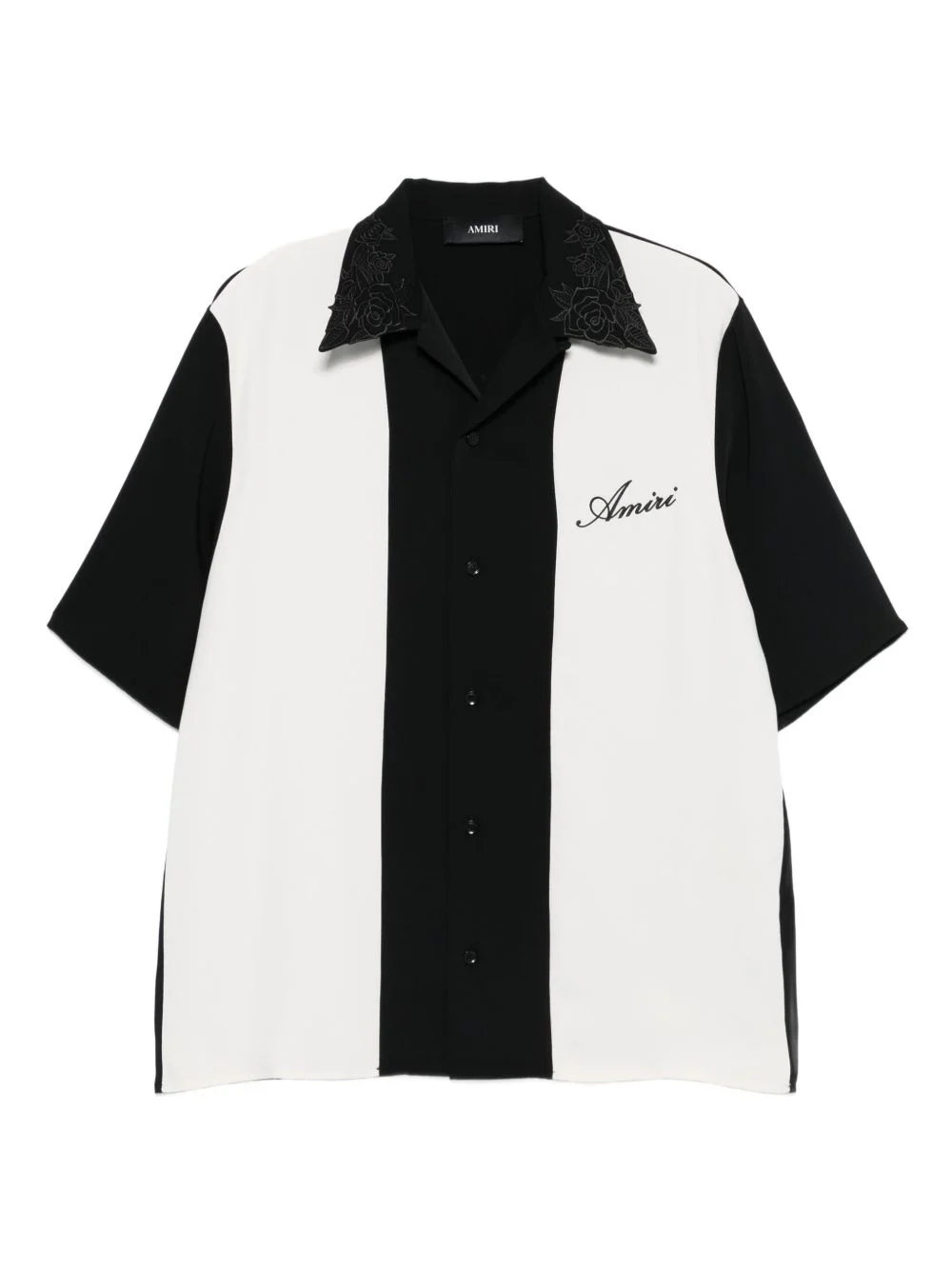 floral-collar panelled shirt Highlights - Black and off-white - Floral embroidered collar - Panelled design - Short sleeves - Button fastening - Camp collar Made in Italy Composition Polyester 100% SIZE & FIT Model measurements Height 6 ft 2 in(1.87 m) Bust/Chest 36.41 in(92.5 cm) Hips 37 in(94 cm) Waist 29.52 in(75 cm) Washing instructions Dry Clean Only