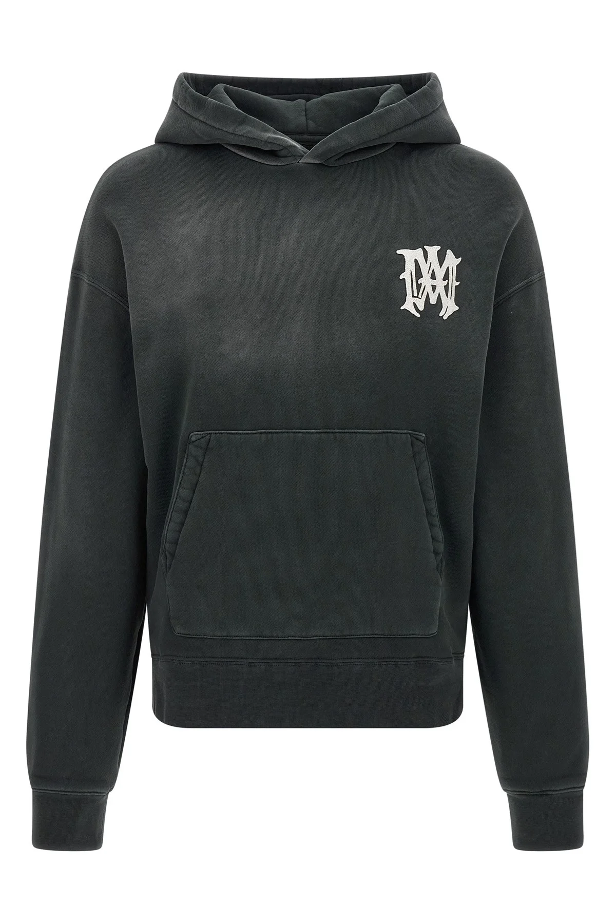 cod. AMTOJR1078001 'Amiri Hollywood' hoodie in brushed cotton treated with faded effect from the sun, felt patch on the front and back, kangaroo pocket, long sleeves with cuffs and dropped shoulders, band on the hem. This garment has undergone a special process that has resulted in intentional variations in shades and colors and adds unique characteristics to the garment. Color: Black Size & Fit: oversized fit Composition: 100% cotton Made in: Italy