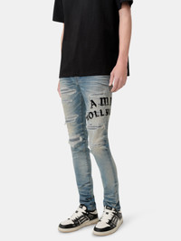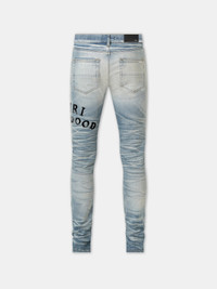 FOR PRE-FALL 2025, MOTIFS PAY HOMAGE TO THE STORIED VENUES OF HOLLYWOOD BOULEVARD. THE AMIRI HOLLYWOOD REPAIRED JEAN IN ITALIAN STRETCH DENIM IS HAND-DISTRESSED AND ILLUSTRATED WITH FLOCKED LETTERING. PRE-FALL 2025 COLLECTION MADE IN USA 92% COTTON, 6% ELASTOMULTIESTERE, 2% ELASTANE THIS GARMENT HAS UNDERGONE A SPECIAL PROCESS WHICH RESULTS IN INTENTIONAL VARIATIONS OF SHADING AND COLOR, AND ADD TO THE PIECE'S UNIQUE CHARACTERISTICS. THIS MAY LEAD TO BLEEDING OR DYE TRANSFER. PLEASE USE CAUTION WHEN WASHING OR DRY-CLEANING THIS ITEM STYLE:AMDNSY1152-515 SIZE & FIT MODEL IS WEARING SIZE 30 MODEL MEASUREMENTS: HEIGHT: 6’2” CHEST: 38" WAIST: 28" HIP: 34.5" PRODUCT MEASUREMENTS (SIZE 30): WAIST: 31" RISE: 10.25" HIP: 37" INSEAM: 34"
