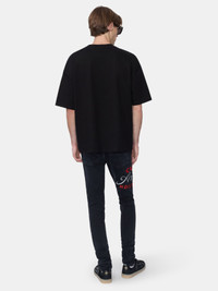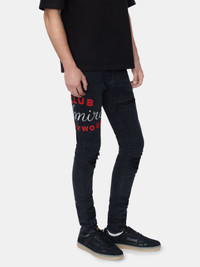FOR AUTUMN-WINTER 2025, DENIM BECOMES A CANVAS FOR INTRICATE AND NOVEL FABRICATION. THE CLUB AMIRI MX1 JEAN IN ITALIAN STRETCH DENIM IS HAND-DISTRESSED, REPAIRED WITH PLEATED SUEDE, AND FINISHED WITH PATCH APPLIQUE AND CRYSTAL EMBELLISHMENTS AUTUMN-WINTER 2025 COLLECTION MADE IN ITALY 92% COTTON, 6% ELASTOMULTIESTERE, 2% ELASTANE THIS GARMENT HAS UNDERGONE A SPECIAL PROCESS WHICH RESULTS IN INTENTIONAL VARIATIONS OF SHADING AND COLOR, AND ADD TO THE PIECE'S UNIQUE CHARACTERISTICS. THIS MAY LEAD TO BLEEDING OR DYE TRANSFER. PLEASE USE CAUTION WHEN WASHING OR DRY-CLEANING THIS ITEM STYLE:AMDNSY1168-635 SIZE & FIT MODEL MEASUREMENTS: HEIGHT: 6’1.5" CHEST: 36.5" WAIST: 28" HIP: 36" PRODUCT MEASUREMENTS (SIZE 30): WAIST: 30.5" RISE: 10.25" HIP: 37" INSEAM: 34"