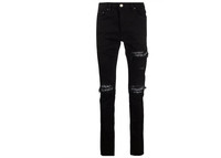 The AMIRI MX1 Bandana Jeans Black is a pair of Black twill denim jeans with a skinny fit and five-pocket riveted styling. Designer Mike Amiri launched AMIRI from Los Angeles, California, in 2014, after working in the pop music industry. After creating custom outfits for major artists to wear on stage, Amiri created his namesake brand to showcase his unique take on streetwear and ready-to-wear separates. The MX1 has been crafted with various options of printed inserts, which quickly fly off the shelves and become covetable. At the Black AMIRI MX1 Bandana Jeans, the left leg features two distressed holes above the knee, while the right leg has one hole above the knee. The holes are lined in Black Bandana print fabric with white details. Our experts feel that the best feature of the Bandana Jeans is their Bandana inserts, which offer a new perspective on distressed denim. The AMIRI MX1 Bandana Jeans Black was released in the Fall / Winter 2022 collection, and retailed at $1090. - Season FW22 - Color Black - Style PXMDS154-018 - Retail Price 1090 - Featured false