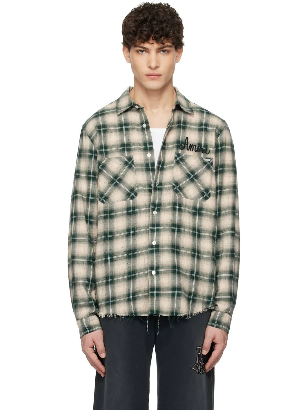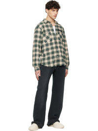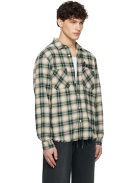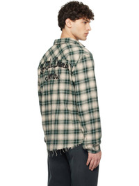 Cotton flannel shirt. Distressing and check pattern throughout. · Spread collar · Button closure · Logo embroidered at chest · Logo hardware and patch pockets at front · Frayed edge at shirttail hem · Pleats at single-button barrel cuffs · Logo and text embroidered at back Supplier color: Evergreen