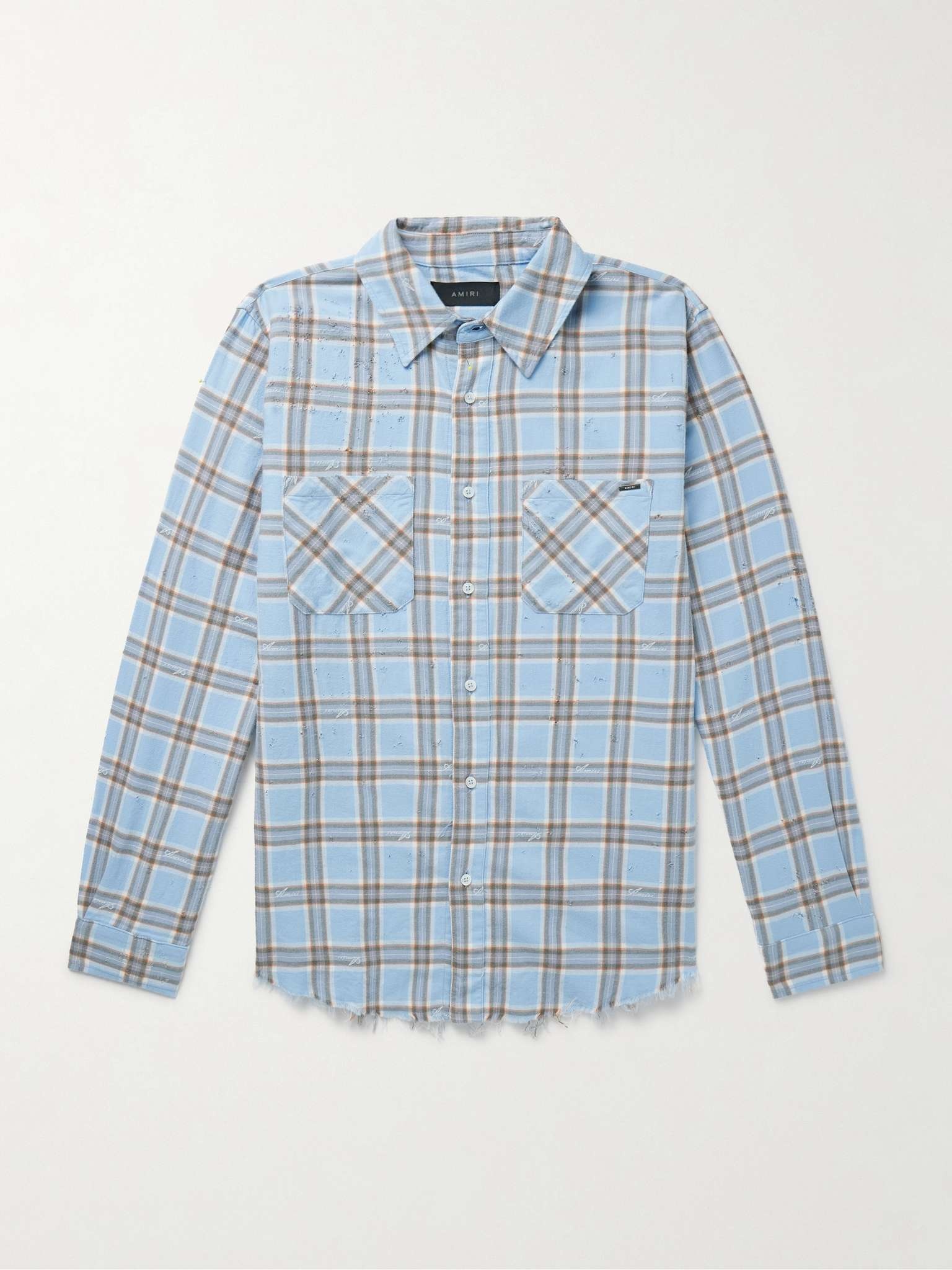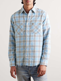 This shirt is part of AMIRI's 'Shotgun' collection, featuring heavily distressed pieces inspired by signature styles blasted with bullets. Cut from soft, checked cotton-flannel, it's appliqued with the brand name - in the same fabric - across the back and has a raw, frayed hem. Size & Fit - Fits true to size. Take your normal size - Designed for a relaxed fit - Mid-weight, non-stretchy fabric - Model is shown wearing a S - Model measures: chest 36"/ 92cm, height 6'2"/ 188cm Details & Care - Multicoloured cotton-flannel - Button fastenings - 100% cotton - Spot clean - Designer colour: Sea Blue