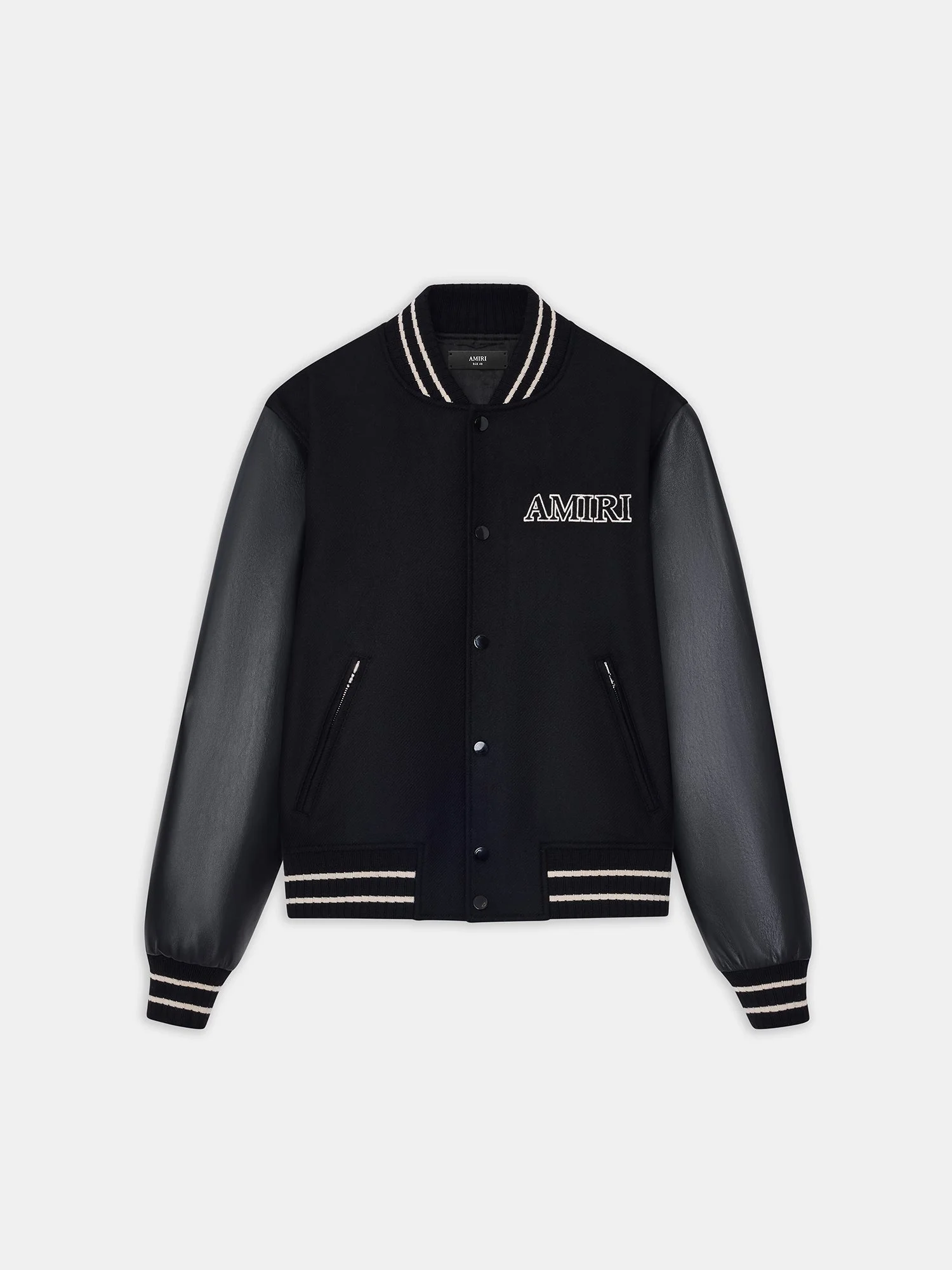 THE AUTUMN-WINTER 2025 MENSWEAR COLLECTION REIMAGINES VINTAGE COLLEGIATE ICONOGRAPHY THROUGH A HOUSE SIGNATURE LENS. THE AMIRI VARSITY JACKET IS CRAFTED FROM WOOL WITH CONTRAST SLEEVES AND FEATURES CHENILLE APPLIQUE, WELT ZIPPER POCKETS, SNAP BUTTON CLOSURE, AND BANDED RIB FINISHES. AUTUMN-WINTER 2025 COLLECTION MADE IN ITALY 75% WOOL, 25% NYLON THIS GARMENT HAS UNDERGONE A SPECIAL PROCESS WHICH RESULTS IN INTENTIONAL VARIATIONS OF SHADING AND COLOR, AND ADD TO THE PIECE'S UNIQUE CHARACTERISTICS. THIS MAY LEAD TO BLEEDING OR DYE TRANSFER. PLEASE USE CAUTION WHEN WASHING OR DRY-CLEANING THIS ITEM STYLE:AMOUVY1016-001 SIZE & FIT MODEL MEASUREMENTS: HEIGHT: 6’1.5" CHEST: 36.5" WAIST: 28" HIP: 36" PRODUCT MEASUREMENTS (SIZE M): CHEST: 46.24" SHOULDER: 37.04" LENGTH: 37.08" SLEEVE LENGTH: 36.4"