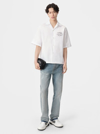 AN HOMAGE TO AMIRI'S ARTS DISTRICT ORIGINS APPEARS IN FAMILIAR FORM IN THIS SHIRT IN CRISP COTTON. THE ARTS DISTRICT CAMP SHIRT IS DESIGNED IN AN EASY FIT AND FINISHED WITH A NOTCHED COLLAR AND BUTTON-DOWN CLOSURE. CORE COLLECTION MADE IN ITALY 100% POPLIN THIS GARMENT HAS UNDERGONE A SPECIAL PROCESS WHICH RESULTS IN INTENTIONAL VARIATIONS OF SHADING AND COLOR, AND ADD TO THE PIECE'S UNIQUE CHARACTERISTICS. THIS MAY LEAD TO BLEEDING OR DYE TRANSFER. PLEASE USE CAUTION WHEN WASHING OR DRY-CLEANING THIS ITEM. STYLE:AMSTBW1019-100