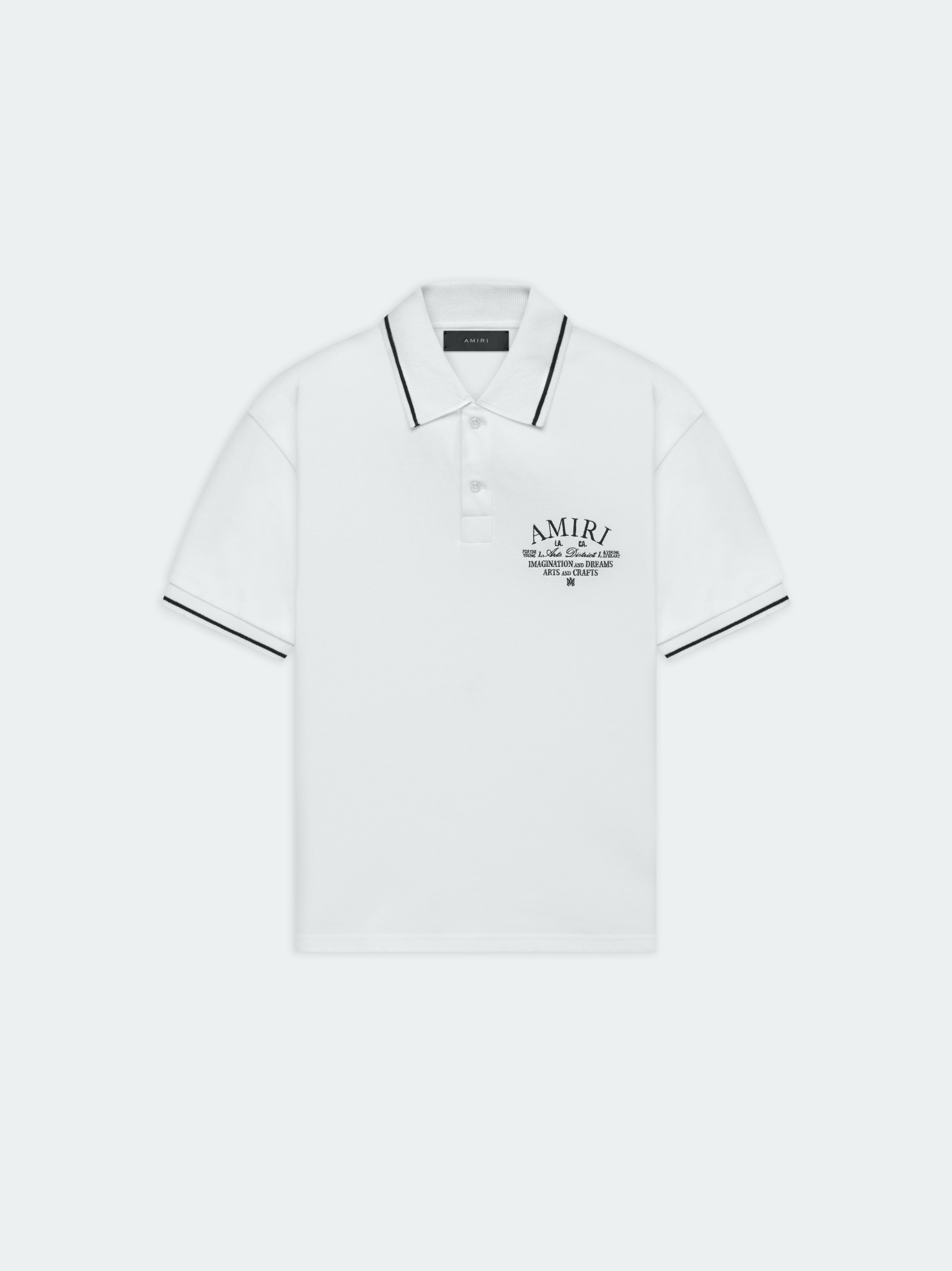 THIS CLASSIC POLO IN PIQUE COTTON PAYS HOMAGE TO AMIRI'S ROOTS IN LA’S ARTS DISTRICT WITH HOUSE LOGO GRAPHICS THAT SPEAK TO THE CITY'S CREATIVE SPIRIT. ACCENTED WITH CONTRAST STRIPING AND BACK MA ICON, THIS POLO MAKES A SUBTLE STATEMENT THROUGH TIME-HONORED FORM. PRE-SPRING 2024 COLLECTION MADE IN ITALY 100% COTTON DRY CLEAN ONLY