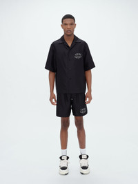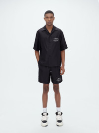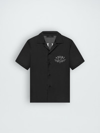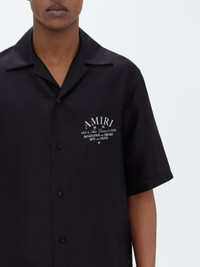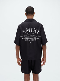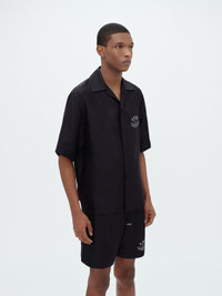CELEBRATING THE CREATIVE SPIRIT OF LOS ANGELES' ARTS DISTRICT, THIS SILK SHIRT IS EMBROIDERED WITH HOUSE LOGO GRAPHICS THAT REFERENCE AMIRI'S ROOTS IN ARTISANAL CRAFT. CHARACTERIZED BY A NOTCHED LAPEL AND MONOCHROME BUTTON DOWN CLOSURE, THE SHIRT ANCHORS BOLD GRAPHICS IN LIGHTWEIGHT SILK TWILL. MODEL IS 6'1" AND WEARS A SIZE MEDIUM MADE IN ITALY 100% SILK DRY CLEAN RECOMMENDED