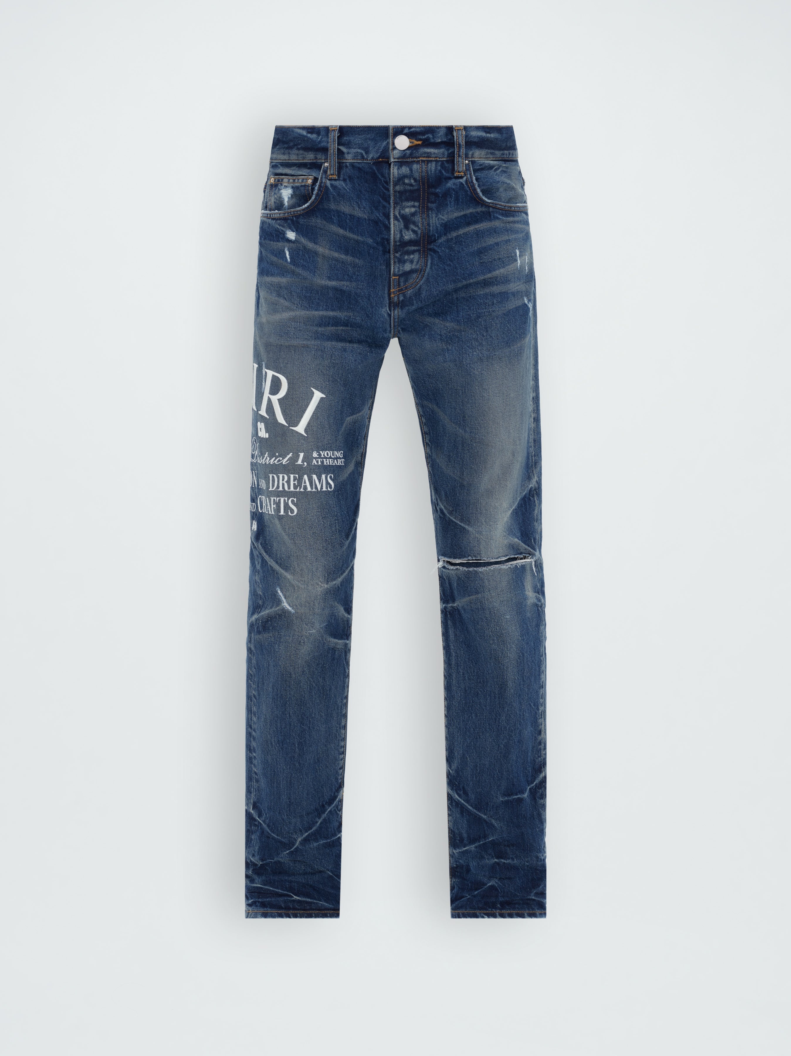 THESE STRAIGHT FIT JEANS HONOR AMIRI'S LA ARTS DISTRICT ORIGINS WITH EMBROIDERED HOUSE LOGO GRAPHICS THAT SPEAK TO THE CITY'S CREATIVE SPIRIT. CRAFTED WITH CLASSIC FIVE-POCKET CONSTRUCTION, THESE JEANS IN ITALIAN DENIM ARE ARTFULLY HAND-DISTRESSED AND ABRADED FOR A WELL-WORN VINTAGE FEEL. MODEL IS 6'1" AND WEARS A SIZE 29 MADE IN USA 100% COTTON DRY CLEAN RECOMMENDED