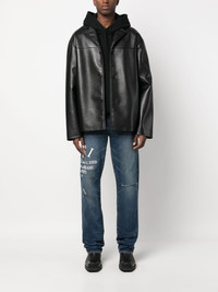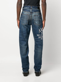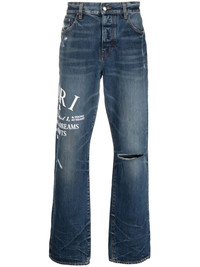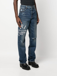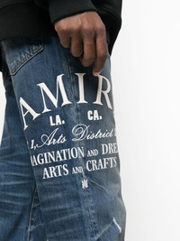 Arts District straight-leg jeans AMIRI takes an artful approach to classic denim in the Arts District jeans. They're printed with a bold contrasting logo at the straight leg and detailed with distressed knees and fading throughout. Highlights - Indigo blue - Cotton - Logo print to the front - Ripped detailing - Mid-rise - Belt loops - Front button fastening - Classic five pockets - Straight leg Made in Italy Composition Cotton 100% SIZE & FIT Model measurements Height 6 ft 0 in(1.84 m) Bust/Chest 34.64 in(88 cm) Hips 35.03 in(89 cm) Waist 27.95 in(71 cm) FittingInformation Designed with a straight leg, these jeans allow for an unrestricted and comfortable fit over the leg Sturdy and hard-wearing, this denim piece offers no stretch This piece fits true to size – take your usual size Measurement INSIDE LEG 35 in(88.9 cm) Hem Width 15.98 in(40.6 cm) FRONT RISE 12 in(30.5 cm) WAIST 32.99 in(83.8 cm) BACK RISE 14.01 in(35.6 cm) HIPS 40 in(101.6 cm) Washing instructions Dry Clean Only