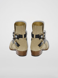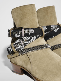 BANDANA BUCKLE BOOTS ADORNED WITH VINTAGE BANDANA STRAPS AND ADJUSTABLE CUBAN CHAIN ACROSS FOREFOOT BANDANA DOUBLE BUCKLE CLOSURE ADJUSTABLE NICKEL CHAIN AND HARDWARE FITS TRUE TO SIZE VESUVIO SUEDE UPPER FULL LEATHER LINING MADE ITALY 1.6 IN, 4.1 CM HEEL