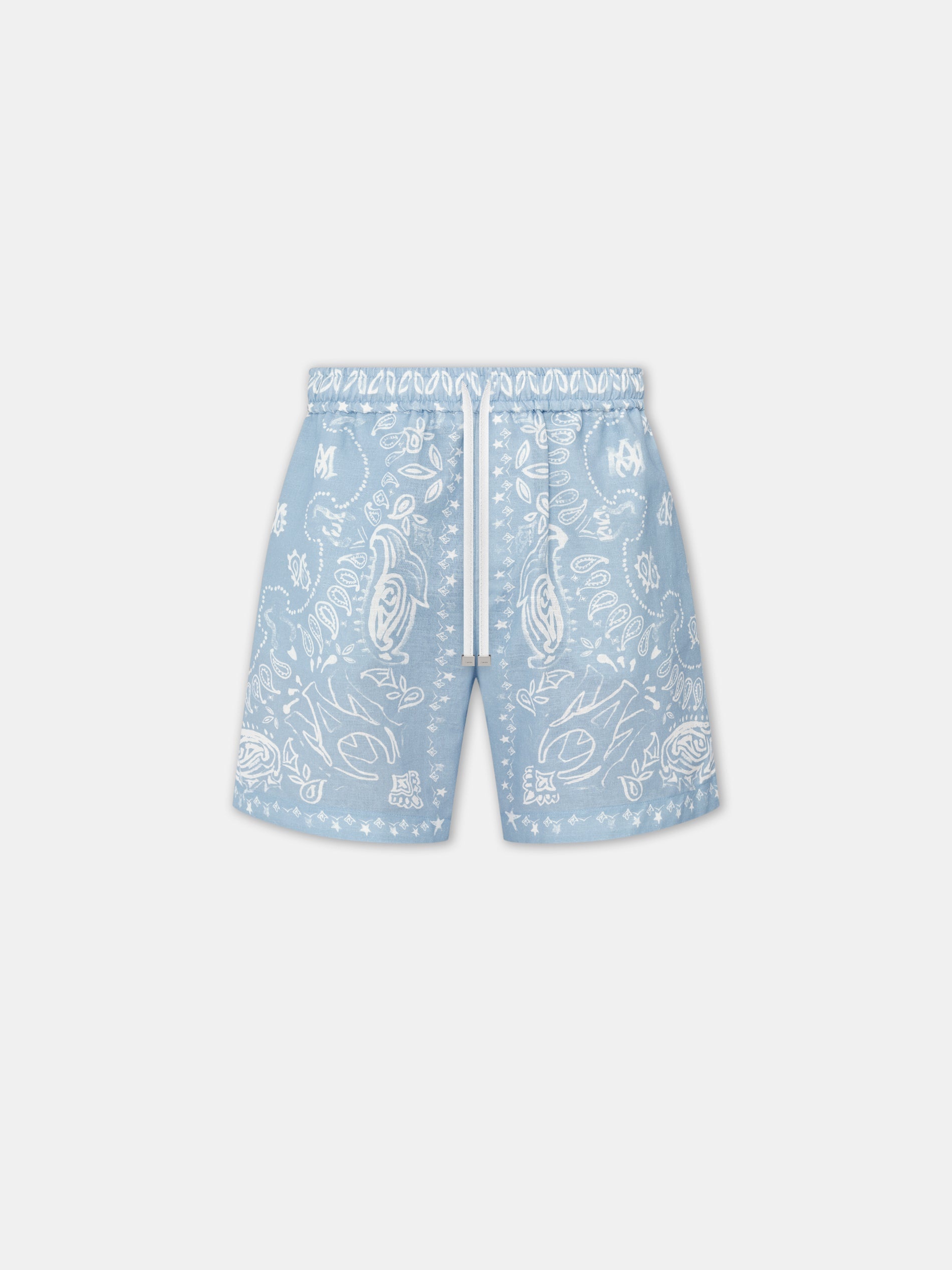 THE PRE-FALL 2024 MENSWEAR COLLECTION EXPLORES TAILORED SILHOUETTES SOFTENED THROUGH LINEN FABRICATION. THE BANDANA WATERCOLOR SHORT IS CUT IN PAINTERLY BANDANA PRINT LINEN COTTON AND FINISHED WITH AN ELASTIC WAISTBAND WITH DRAWCORD. PRE-FALL 2024 COLLECTION MADE IN ITALY 53% LINEN, 47% COTTON
