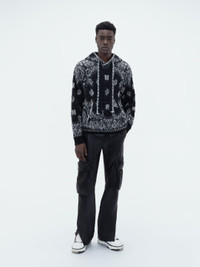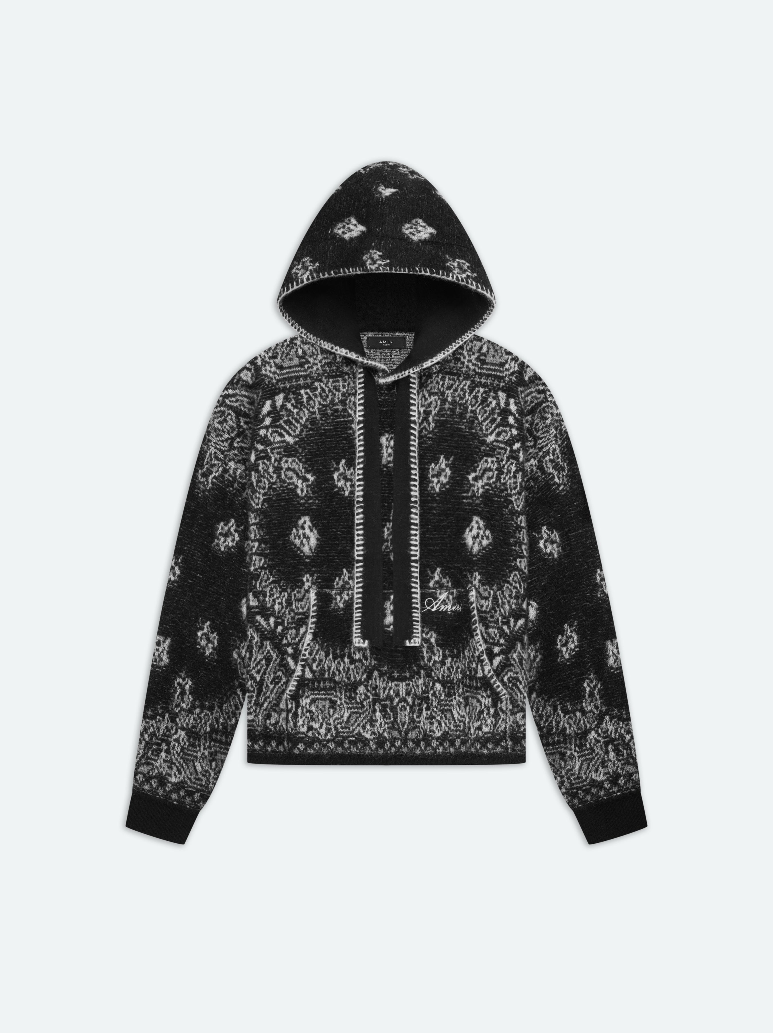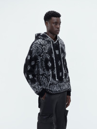 THIS HOODIE INTERPRETS THE DYNAMISM OF THE TIME-HONORED BANDANA MOTIF IN AN EASY, RELAXED FIT. DEFINED BY A KNIT TECHNIQUE REMINISCENT OF ANTIQUE TEXTILE TRADITIONS, THIS HOODIE IS ANCHORED BY SCRIPT AMIRI LOGO, A SPACIOUS KANGAROO POCKET AND DISTINCTIVE WHIP STITCH DETAILING. PRE-SPRING 2024 COLLECTION MADE IN ITALY 37% FIBRA POLIAMMIDCA 26% FIBRA POLIACRILICA 25% ALPACA SUPERFINE 10% LANA MERINOS, 2% ELASTAN DRY CLEAN ONLY