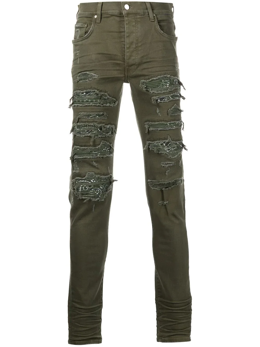 Bandana Thrasher skinny jeans Part of AMIRI's SS22 collection, these skinny jeans get their name from the bandana patches that appear on the front. In an olive-green colourway, this pair is decorated with ripped details that open to tonal panels. Made in United States Composition Body: Cotton 92%, Elastane 8% Washing instructions Dry Clean Only
