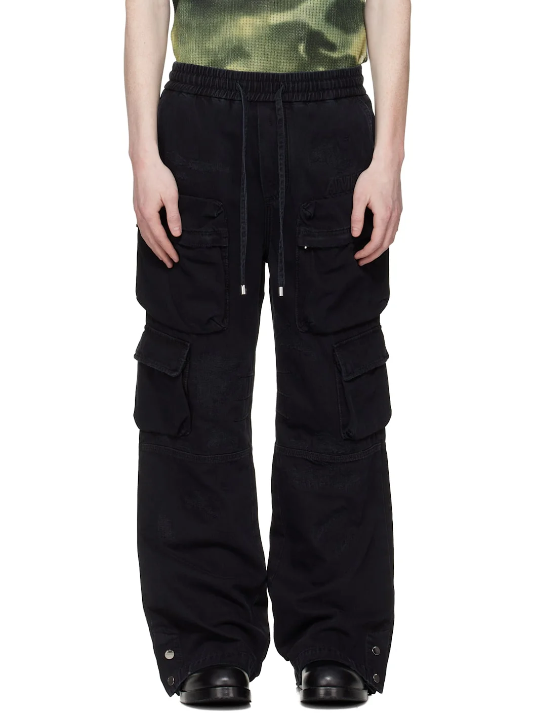 Overdyed non-stretch denim jeans. · Fading and hand-distressing throughout · Drawstring at elasticized waistband · Four-pocket styling · Zip fly · Logo embroidered at front · Cargo pockets at legs · Press-stud vent at cuffs · Logo patch at back waistband · Logo plaque at back pocket Supplier color: Vintage Black 100% cotton. Made in Italy 261886M186011