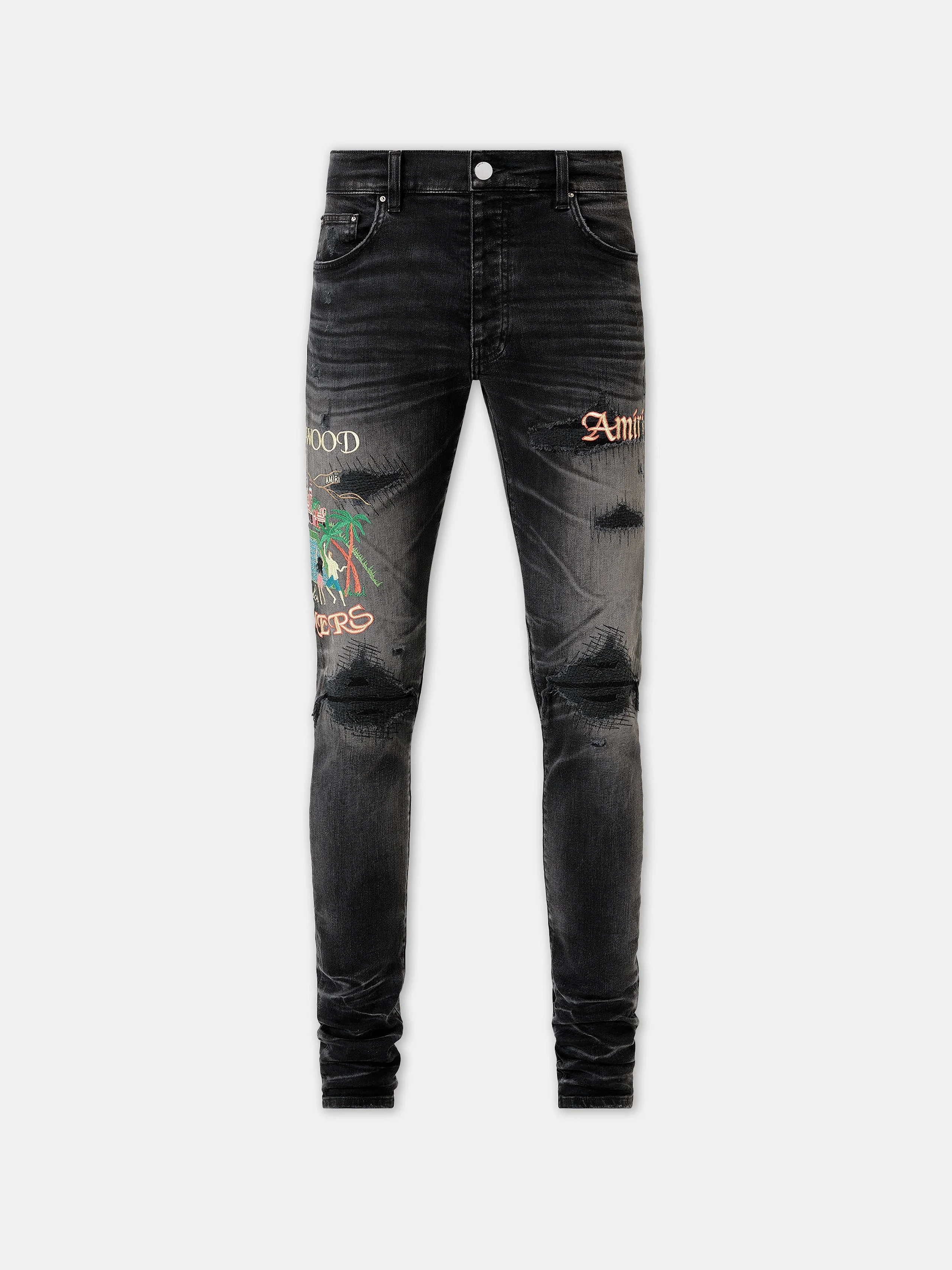 PRE-FALL 2025 DRAWS UPON THE NOTION OF HOLLYWOOD "SINNERS," WITH A PLAYFUL TAKE INSPIRED BY LA'S RAUCOUS 1970S. THE EMBROIDERED SINNERS SKINNY JEAN IN ITALIAN STRETCH DENIM IS HAND-DISTRESSED AND REPAIRED AND FINISHED WITH CLASSIC FIVE-POCKET DETAILING. PRE-FALL 2025 COLLECTION MADE IN USA 92% COTTON, 6% ELASTOMULTIESTERE, 2% ELASTANE THIS GARMENT HAS UNDERGONE A SPECIAL PROCESS WHICH RESULTS IN INTENTIONAL VARIATIONS OF SHADING AND COLOR, AND ADD TO THE PIECE'S UNIQUE CHARACTERISTICS. THIS MAY LEAD TO BLEEDING OR DYE TRANSFER. PLEASE USE CAUTION WHEN WASHING OR DRY-CLEANING THIS ITEM STYLE:AMDNSY1156-051 SIZE & FIT MODEL IS WEARING SIZE 30 MODEL MEASUREMENTS: HEIGHT: 6’2” CHEST: 35.5" WAIST: 28" HIP: 34.5" PRODUCT MEASUREMENTS (SIZE 30): WAIST: 30.5" RISE: 10.25" HIP: 37" INSEAM: 34"