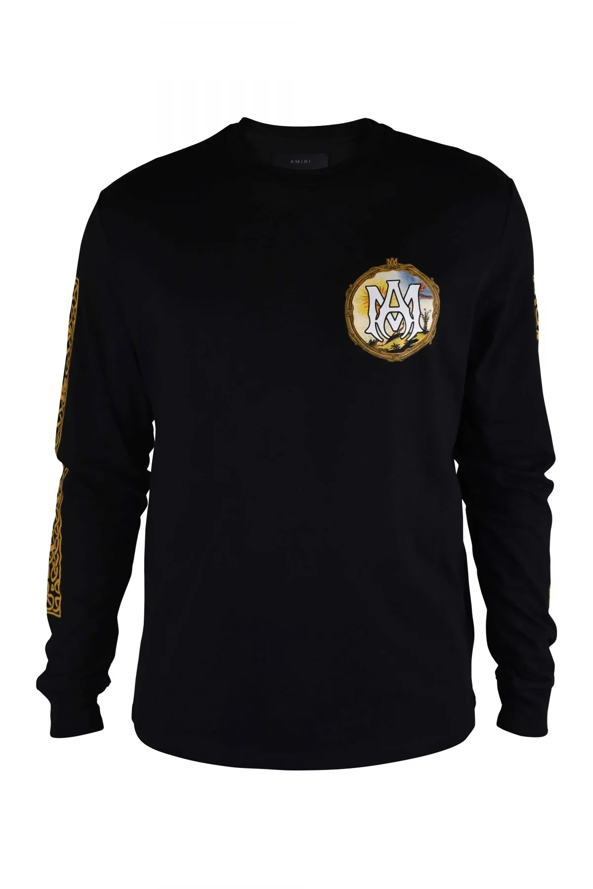 Alchemy Frame Amiri t-shirt in black cotton. Graphic print and white logo printed on chest. Gold graphic print along sleeves. Graphic print and white logo printed on back. Long sleeves. Round collar. Made in Italy.