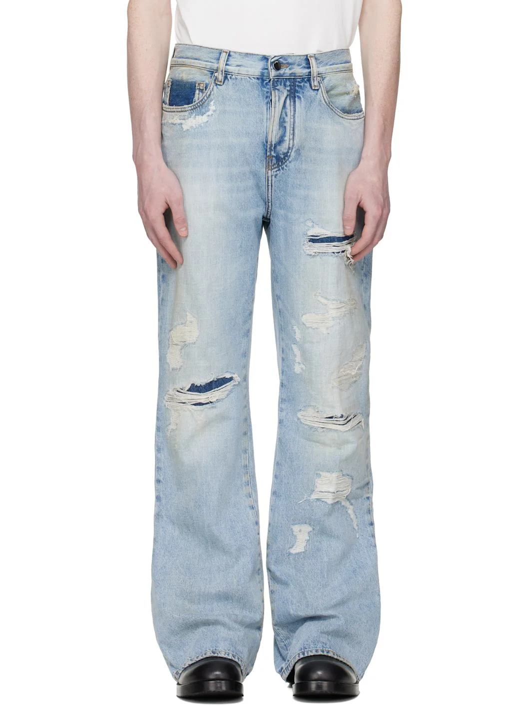 Non-stretch denim jeans. · Fading, whiskering, and distressing throughout · Belt loops · Four-pocket styling · Button fly · Denim underlay at rips · Suede logo patch at back waistband · Logo patch at back pocket · Logo-engraved silver-tone hardware · Contrast stitching in tan Supplier color: Classic Vintage Inidgo 100% cotton. Made in Italy 261886M186062