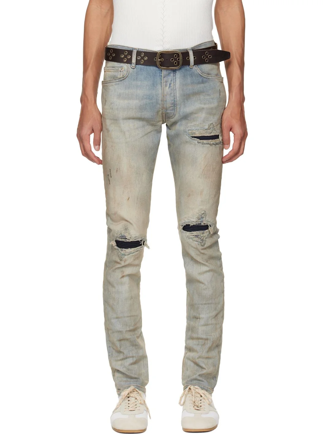Stretch denim jeans. · Fading, whiskering, smudging, and distressing throughout · Belt loops · Five-pocket styling · Button fly · Quilted suede underlay at rips · Leather logo patch at back waistband · Logo plaque at back pocket · Logo-engraved silver-tone hardware Supplier color: Perfect antique indigo Body: 92% cotton, 6% elastomultiester, 2% elastane. Trim: 100% leather. Made in Italy 261886M186007