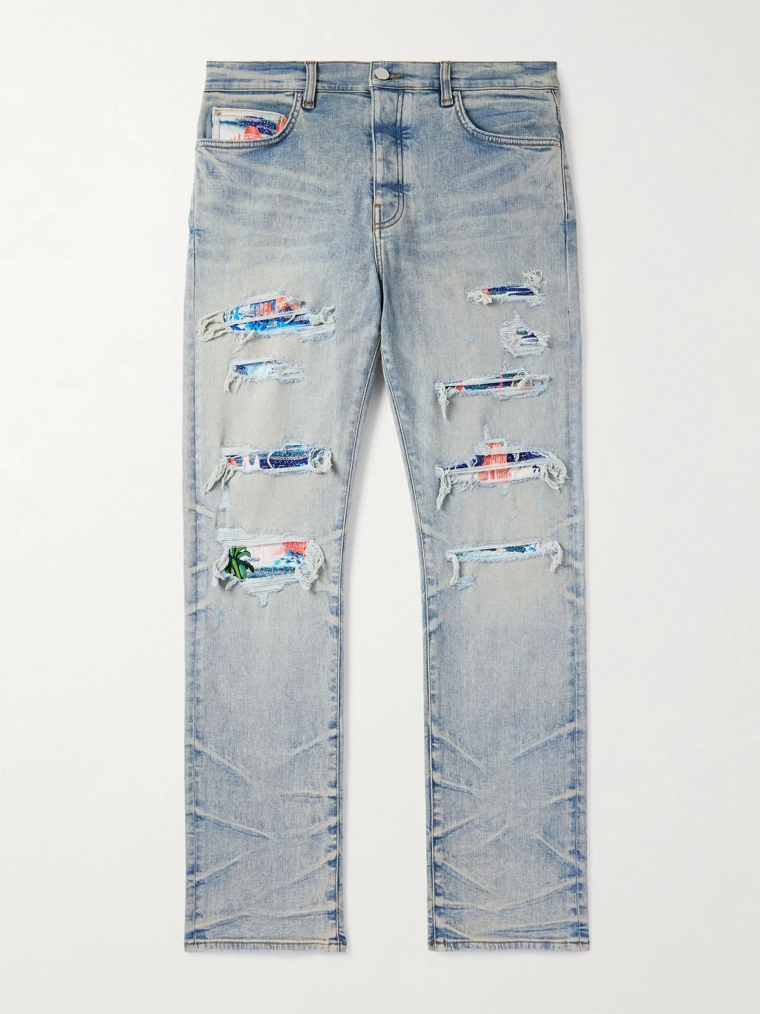 AMIRI's 'Thrasher' jeans have been worn by some of the biggest stars in the world, from athletes to musicians. This 'Aloha' style, named for the embellished tropical motif along the panelling, is cut for a signature skinny fit from light-blue stretch denim and thoroughly distressed by hand. Size & Fit - Model wears a size larger to achieve a looser fit - Slim cut, mid-rise style - Mid-weight, slightly stretchy denim - Model is shown wearing a 33 - Model measures: waist size 32, height 6'0"/ 183cm Details & Care - Light-blue stretch-denim - Button fastenings - 92% cotton, 6% elastomultiester, 2% elastane