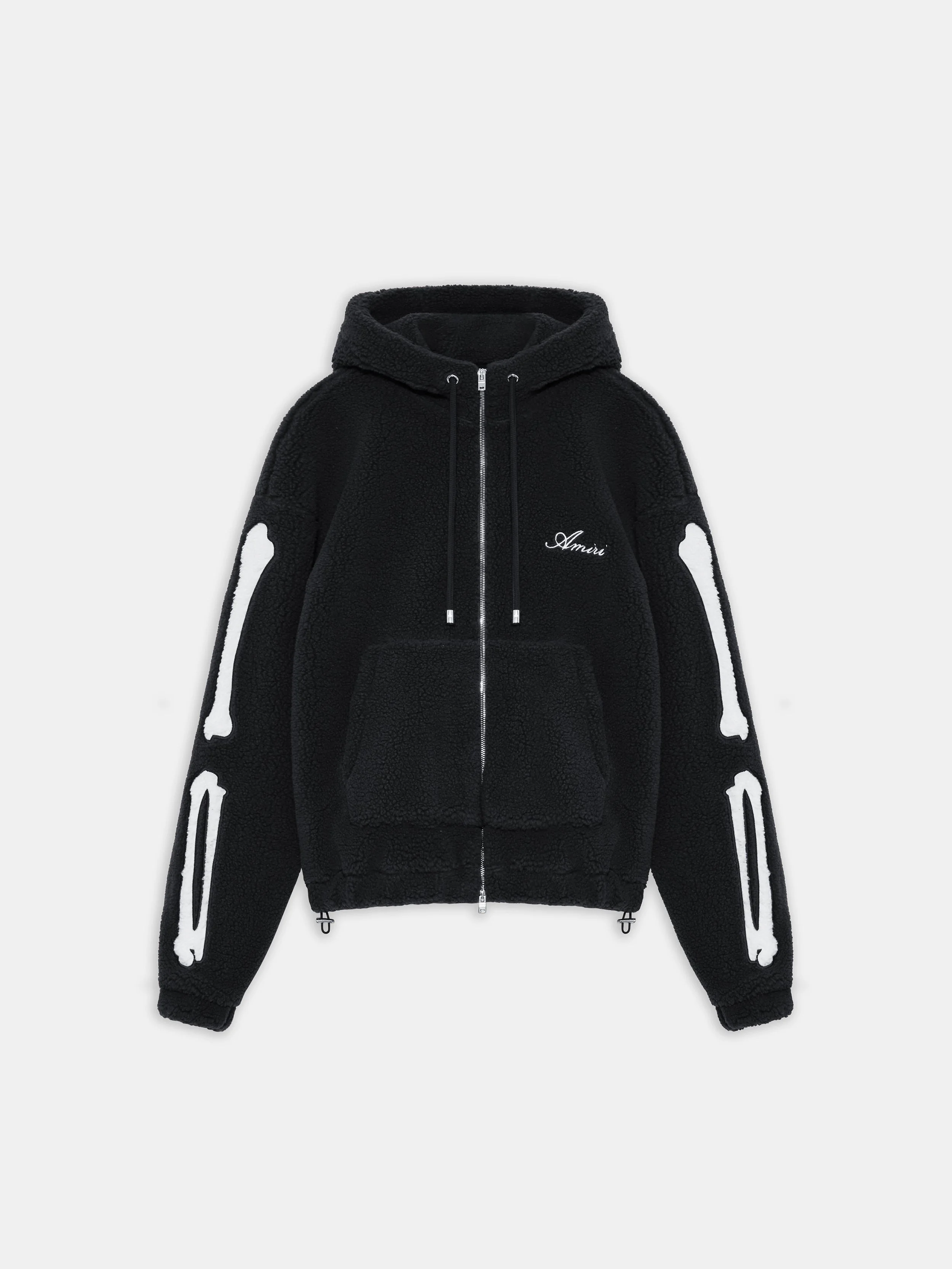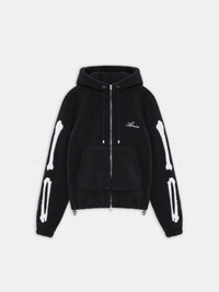 PRE-SPRING 2026 REVIVES THE BONES MOTIF, AN AMIRI SIGNATURE TRACING BACK TO THE HOUSE'S ORIGINS IN A ONE-ROOM ATELIER ON L.A.'S ICONIC SUNSET BOULEVARD. THE BONES FLEECE ZIP HOODIE IS EMBROIDERED WITH THE HOUSE SCRIPT LOGO AT THE CHEST AND FINISHED WITH A KANGAROO POCKET, DRAWCORDS AT THE WAISTBAND, AND DOUBLE-ZIP CLOSURE. PRE-SPRING 2026 COLLECTION MADE IN ITALY 100% POLYESTER THIS GARMENT HAS UNDERGONE A SPECIAL PROCESS WHICH RESULTS IN INTENTIONAL VARIATIONS OF SHADING AND COLOR, AND ADD TO THE PIECE'S UNIQUE CHARACTERISTICS. THIS MAY LEAD TO BLEEDING OR DYE TRANSFER. PLEASE USE CAUTION WHEN WASHING OR DRY-CLEANING THIS ITEM STYLE:AMOUJA1010-001 SIZE & FIT PRODUCT MEASUREMENTS (SIZE M): LENGTH: 26.3 IN SHOULDER: 23.5 IN SLEEVE LENGTH: 24.8 IN