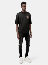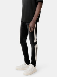 THE HOUSE'S BONES MOTIF ENHANCES SIGNATURE DENIM FOR PRE-FALL 2025. THE BONES SLASH JEAN IN ITALIAN STRETCH DENIM IS HAND-DISTRESSED AND ILLUSTRATED WITH LEATHER BONE APPLIQUES. PRE-FALL 2025 COLLECTION MADE IN USA 92% COTTON, 6% ELASTOMULTIESTERE, 2% ELASTANE THIS GARMENT HAS UNDERGONE A SPECIAL PROCESS WHICH RESULTS IN INTENTIONAL VARIATIONS OF SHADING AND COLOR, AND ADD TO THE PIECE'S UNIQUE CHARACTERISTICS. THIS MAY LEAD TO BLEEDING OR DYE TRANSFER. PLEASE USE CAUTION WHEN WASHING OR DRY-CLEANING THIS ITEM STYLE:AMDNSY1157-097 SIZE & FIT MODEL IS WEARING SIZE 30 MODEL MEASUREMENTS: HEIGHT: 6’2” CHEST: 35.5" WAIST: 28" HIP: 34.5" PRODUCT MEASUREMENTS (SIZE 30): WAIST: 30.5" RISE: 10.25" HIP: 37" INSEAM: 34"