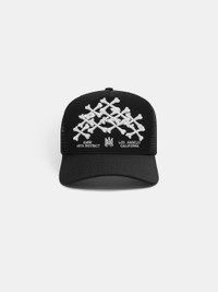 HOUSE SIGNATURE GRAPHICS ILLUSTRATE ACCESSORIES ROOTED IN WEST COAST SAVOIR-FAIRE. THE BONES STACKED TRUCKER HAT IS EMBROIDERED WITH THE STAGGERED BONES MOTIF AND FINISHED WITH A CURVED BRIM, EMBROIDERED EYELETS AND DOUBLE SNAPBACK FASTENING. CORE COLLECTION MADE IN USA SHELL: 100% COTTON, LINING: 100% LYOCELL, MESH: 100% POLYESTER EACH PIECE IS METICULOUSLY CRAFTED AND INHERENTLY UNIQUE. SLIGHT VARIATIONS IN THE ARTWORK ARE A NATURAL RESULT OF THE PRINTING PROCESS AND CONTRIBUTE TO THE DISTINCTIVE CHARACTER OF THIS PRODUCT. STYLE:AMHATR1016-001 SIZE & FIT MEASUREMENTS ARE BASED ON LEAVING 2 SPANS OPEN CROWN CIRCUMFERENCE: 22.875” CROWN HEIGHT: 3.75” VISOR WIDTH: 2.75” PLEASE CONTACT FOR ADDITIONAL INFORMATION.