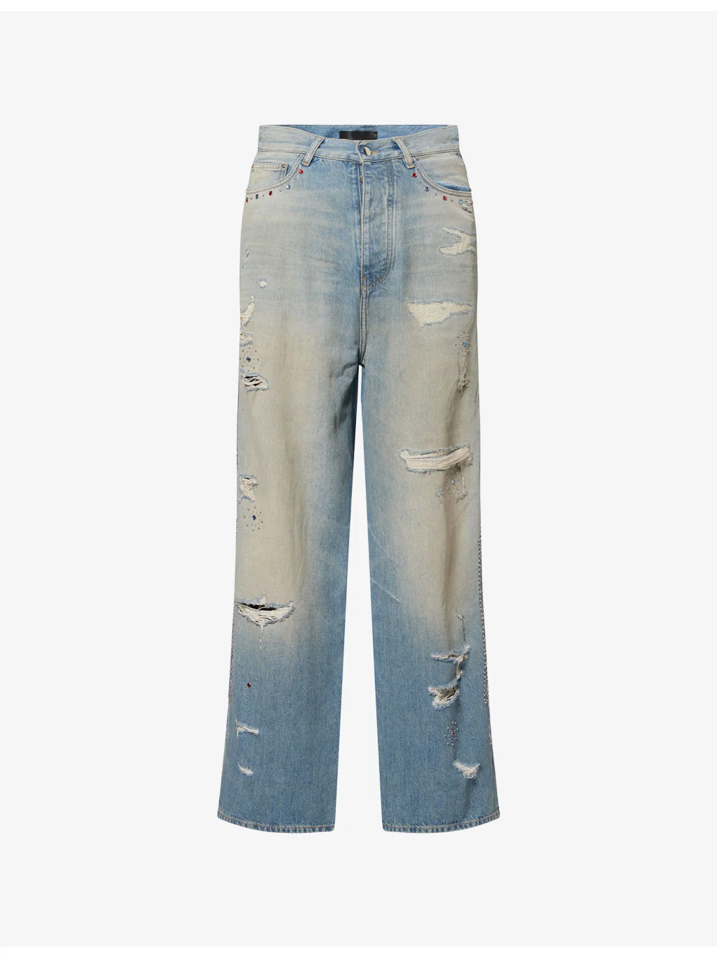 PRODUCT DETAILS - AMIRI denim jeans - 100% cotton - Button and button-fly fastening at front - Baggy fit, mid-rise, straight leg, belt loops, classic five pockets, faded wash, all-over embellished detailing, brand patch at back, distressed finish - Specialist dry clean only - Made in Italy - Size UK 30: rise 15.3in / 39cm, inside leg 31.1in / 79cm, leg opening 22in / 56cm - Model is 6ft 2in/1.88m and wears a size UK 30 - Midweight, non-stretch Ref: R04548569