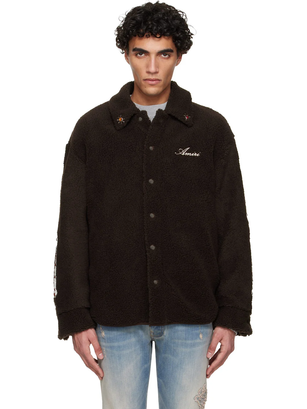Sherpa fleece overshirt. · Spread collar · Rhinestones and studs at collar and sleeves · Press-stud closure · Logo embroidered at chest · Seam pockets at waist · Shirttail hem · Dropped shoulders · Faux-leather graphic appliques at sleeves · Press-stud barrel cuffs · Welt pocket at interior · Full viscose twill lining Supplier color: Dark brown Body: 54% acrylic, 46% polyester. Lining: 100% viscose. Made in Italy 261886M192025