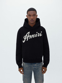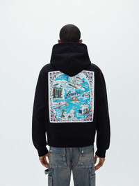 SS23 CALIFORNIAN HAWIIAN HOODIE IN BLACK MADE ITALY 14 OZ SUPIMA COTTON LOOP TERRY MODEL HEIGHT 6' 2", 28" WAIST, 34" INSEAM AND IS WEARING SIZE US: M 100% COTTON DRY CLEAN RECOMMENDED