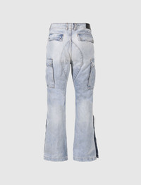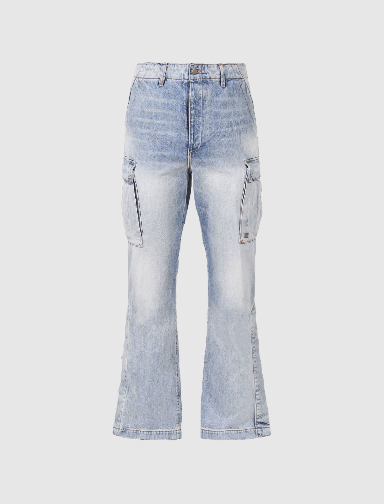 Light wash flared cargo denim jeans. Six-pockets. Slight fading and light distressing throughout. Button-fly closure at front. - 100% Cotton SKU: PS23MDF015-765