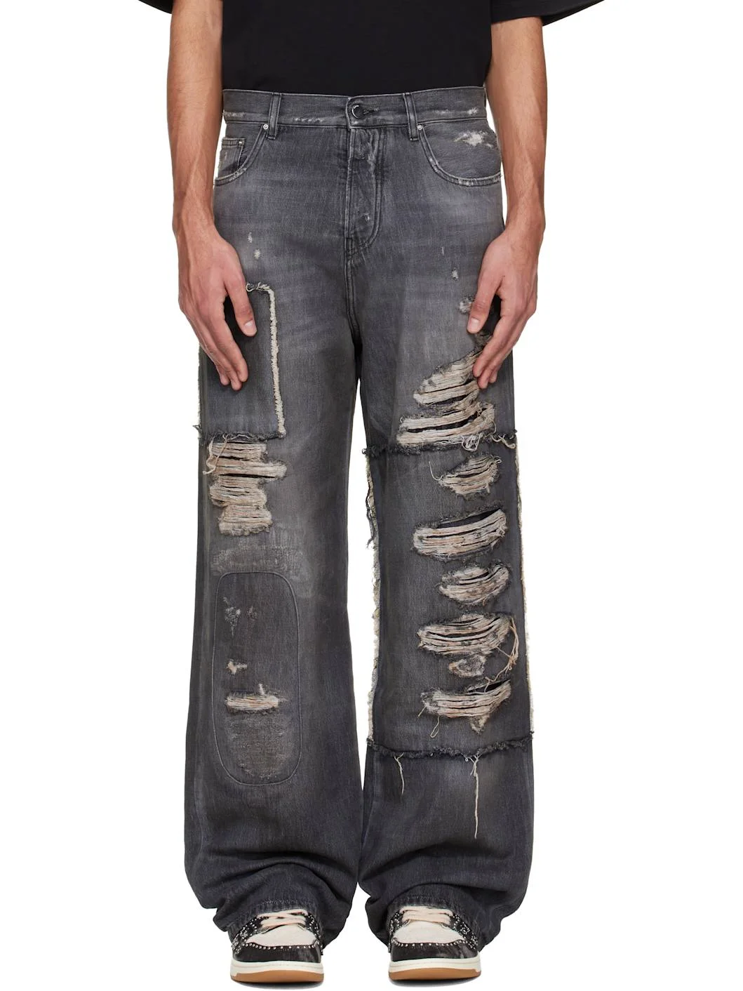 Non-stretch denim jeans. · Fading, whiskering, and distressing throughout · Paneled construction · Belt loops · Five-pocket styling · Button fly · Logo embroidered at front · Logo patch at back waistband · Logo plaque at back pocket · Logo-engraved silver-tone hardware Supplier color: Crafted black Body: 100% cotton. Trim: 65% polyester, 35% cotton. Made in Italy 261886M186024