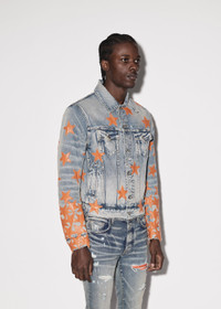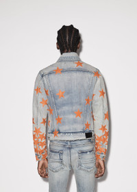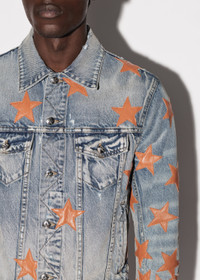 CHEMIST ITALIAN RIGID DENIM JACKET HAND-SEWN LEATHER STAR APPLIQUÉS MADE IN LOS ANGELES, CALIFORNIA CLASSIC SLIM FIT MODEL WEARS A SIZE MEDIUM DETAILS & CARE LIGHT DISTRESSING THROUGHOUT 100% COTTON ITALIAN RIGID DENIM DRY CLEAN RECOMMENDED