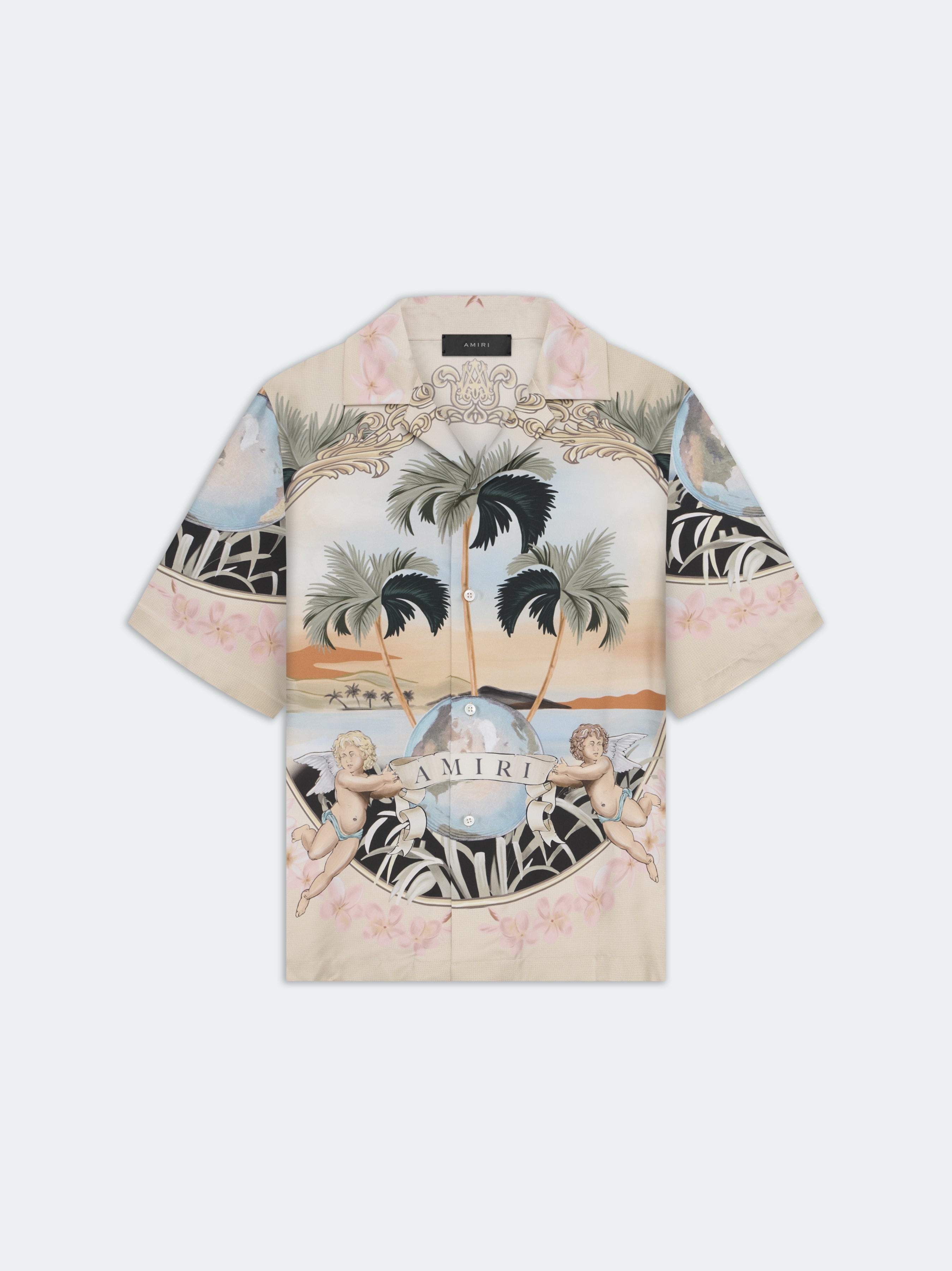 FLYING CHERUBS AND BAROQUE ORNAMENTATION COLLIDE IN A CALIFORNIAN DREAMSCAPE ON THIS SHIRT IN FLUID SILK. CROWNED BY SCENIC PALM TREES AND THE HOUSE LOGO BANNER, THIS SHIRT IS FINISHED WITH FRONT BUTTON CLOSURE AND A NOTCHED LAPEL. THIS SHIRT PAIRS EFFORTLESSLY WITH THE CHERUB SILK SHORT FOR A CHARISMATIC ENSEMBLE. SPRING-SUMMER 2024 COLLECTION MADE IN ITALY 100% SILK TWILL DRY CLEAN