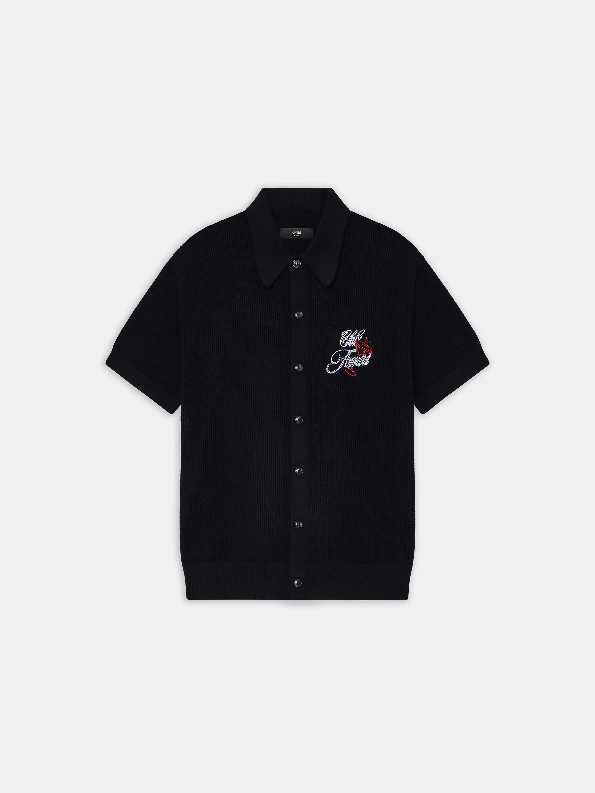 FOR AUTUMN-WINTER 2025, THE SPIRIT OF LOS ANGELES REMAINS AT THE HEART OF AMIRI, WITH GRAPHICS THAT IDEALIZE A FICTIONAL HOLLYWOOD VENUE. THE CLUB AMIRI CROCHET SHIRT IS ILLUSTRATED WITH SEASONAL LOGO EMBROIDERY AND FINISHED WITH RIB ACCENTS AND BUTTON-DOWN CLOSURE. AUTUMN-WINTER 2025 COLLECTION MADE IN ITALY 70% VISCOSE, 30% POLYESTER THIS GARMENT HAS UNDERGONE A SPECIAL PROCESS WHICH RESULTS IN INTENTIONAL VARIATIONS OF SHADING AND COLOR, AND ADD TO THE PIECE'S UNIQUE CHARACTERISTICS. THIS MAY LEAD TO BLEEDING OR DYE TRANSFER. PLEASE USE CAUTION WHEN WASHING OR DRY-CLEANING THIS ITEM STYLE:AMKNIR1035-001 SIZE & FIT MODEL MEASUREMENTS: HEIGHT: 6’1.5" CHEST: 36.5" WAIST: 28" HIP: 36" PRODUCT MEASUREMENTS (SIZE M): CHEST: 24" SHOULDER: 24.375" LENGTH: 28" SLEEVE LENGTH: 7.875"