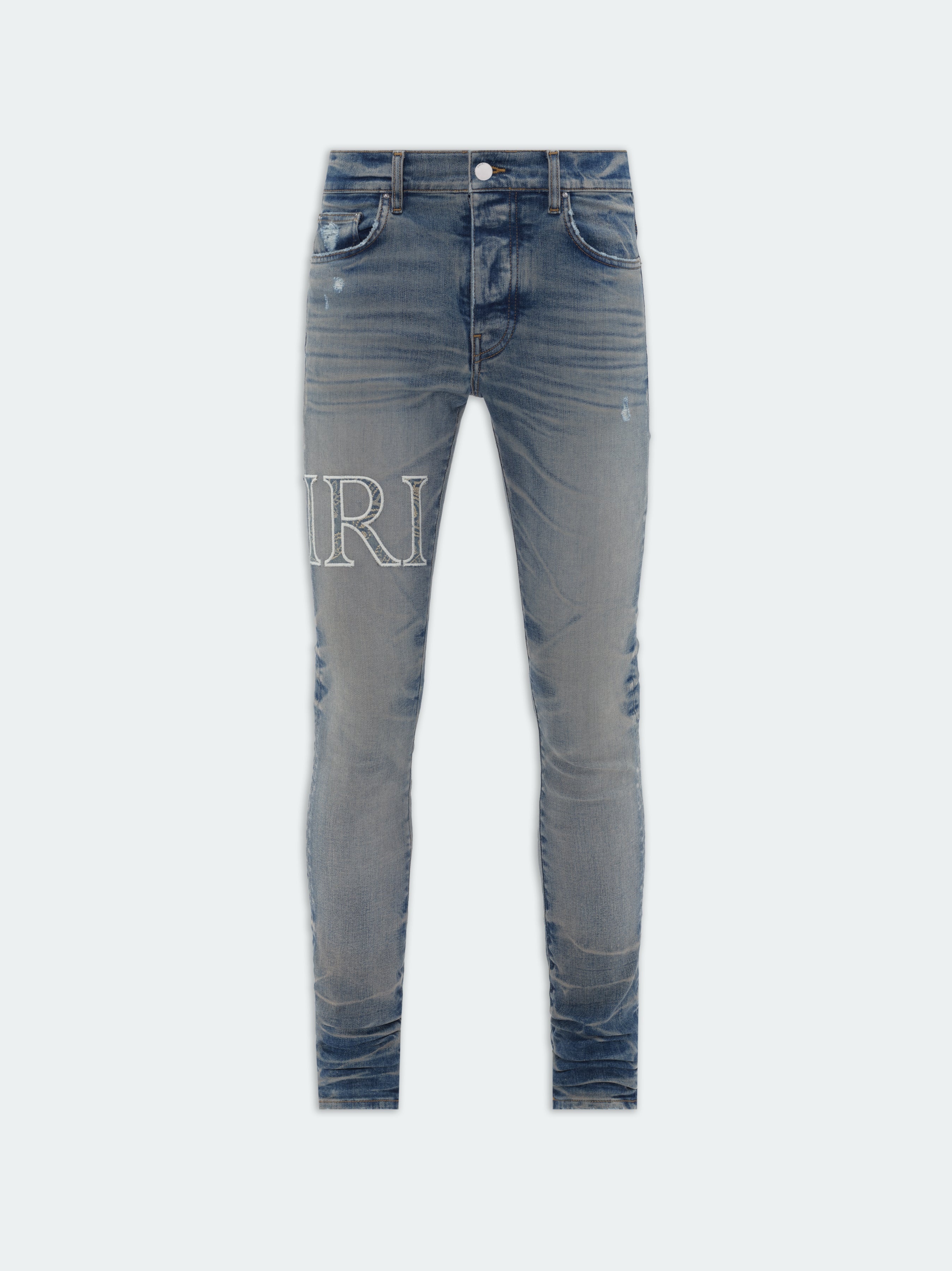 THESE SKINNY-FIT JEANS ARE ADORNED WITH THE AMIRI HOUSE LOGO IN AN EMBROIDERED APPLIQUÉ TREATMENT FEATURING THE SEASON'S BANDANA JACQUARD TEXTILE. CRAFTED FROM ITALIAN STRETCH DENIM, THESE JEANS ARE ARTFULLY HAND-DISTRESSED AND FINISHED WITH CLASSIC FIVE-POCKET CONSTRUCTION. PRE-SPRING 2024 COLLECTION MADE IN USA 92% COTTON 6% ELASTOMULTIESTER 2% ELASTANE DRY CLEAN ONLY