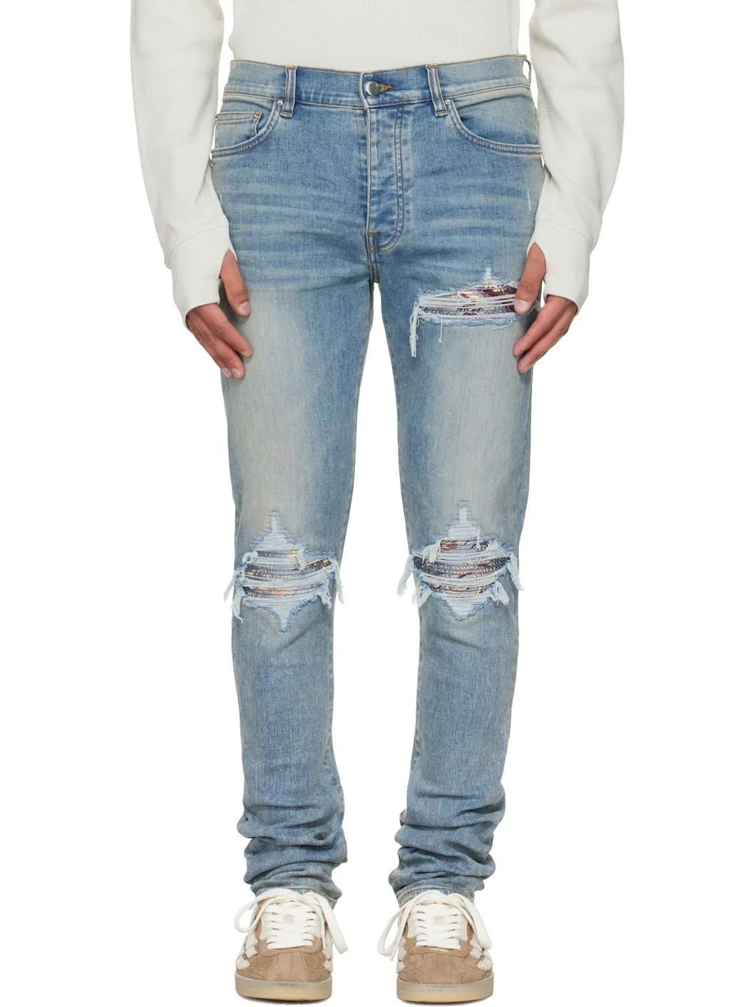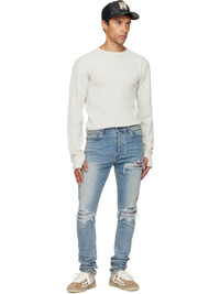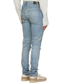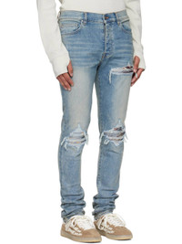 Stretch denim jeans. · Fading, whiskering, and distressing throughout · Belt loops · Five-pocket styling · Button fly · Rips with quilted jacquard underlays at front · Logo patch at back waistband · Jacquard graphic at back pocket · Logo plaque at back pocket · Contrast stitching in tan Supplier color: Medium indigo Trim: 55% polyester, 27% acetate, 12% cotton, 6% feather. Body: 92% cotton, 6% elastomultiester, 2% elastane. Made in United States 252886M186052