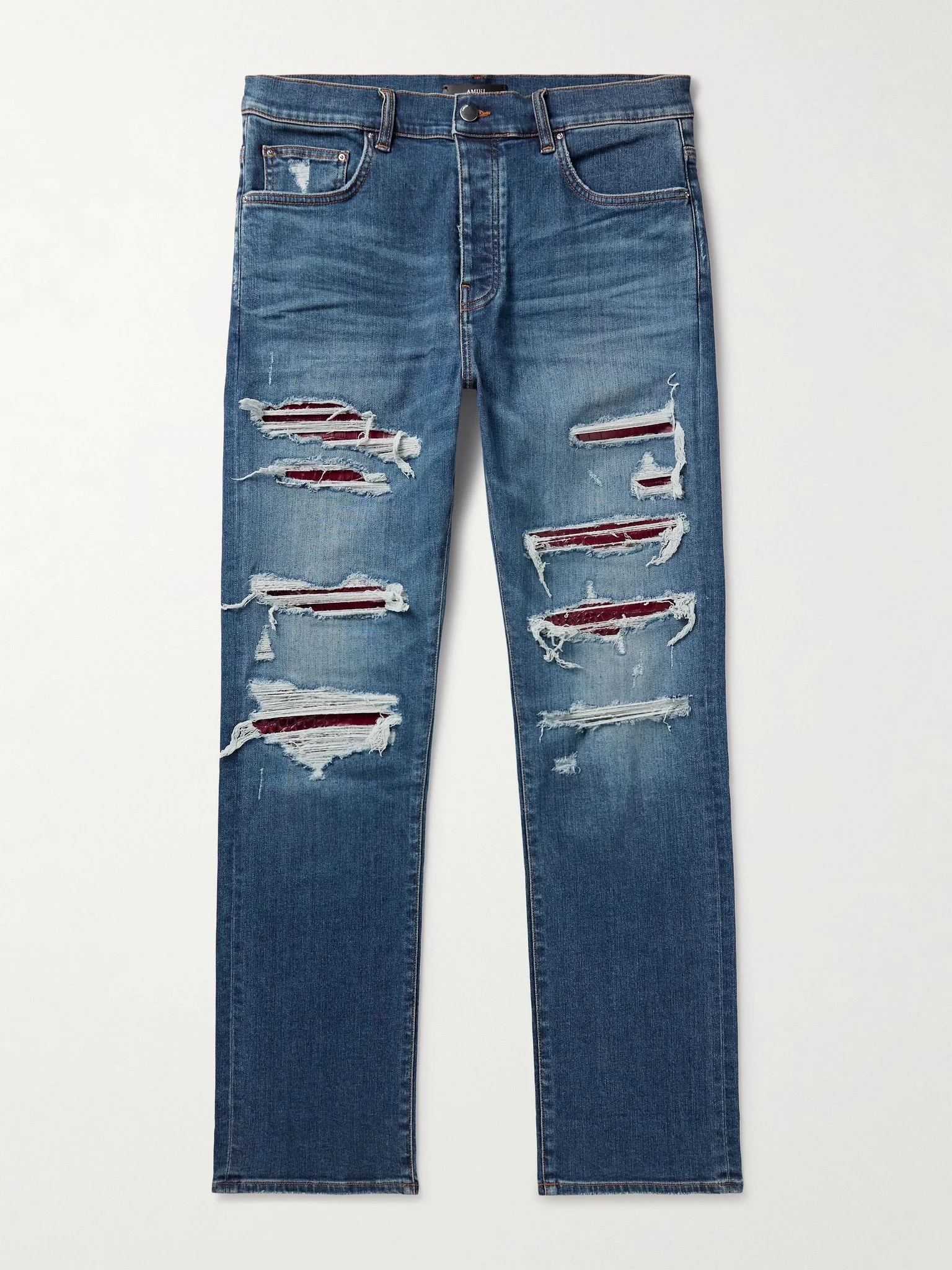 AMIRI's 'Thrasher' jeans have been worn by some of the biggest stars in the world, from athletes to musicians. This version, with its croc-effect leather panelling, is cut for a signature slim fit from blue stretch-denim and thoroughly distressed by hand. Size & Fit - Fits true to size. Take your normal size - Those with muscular legs may wish to take the next size up - Slim cut, low-crotch style - Mid-weight, stretchy denim - Model is shown wearing a 30 - Model measures: waist size 30, height 6'2"/ 188cm Details & Care - Blue stretch-denim, red croc-effect leather - Button fastenings - 92% cotton, 6% elastomultiester, 2% elastane; trim: 100% leather (Cow) - Dry clean
