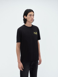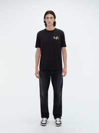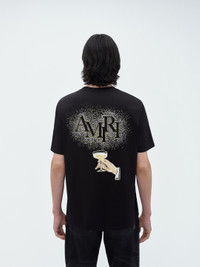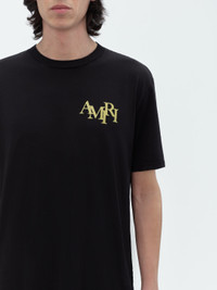 LIGHT-CATCHING CRYSTALS ILLUMINATE A CELEBRATORY TOAST ON THIS COTTON TEE. THE AMIRI STAGGERED LOGO IS FRAMED IN NEGATIVE SPACE AMID IMAGERY THAT CHANNELS THE AURA OF JAZZ BARS OF THE 1960S. THIS TEE IS FINISHED WITH FRONT CHEST LOGO AND IS A STRIKING ACCOMPANIMENT TO HOUSE DENIM OFFERINGS. PRE-SPRING 2024 COLLECTION MADE IN USA 100% COTTON DRY CLEAN ONLY