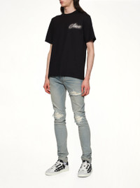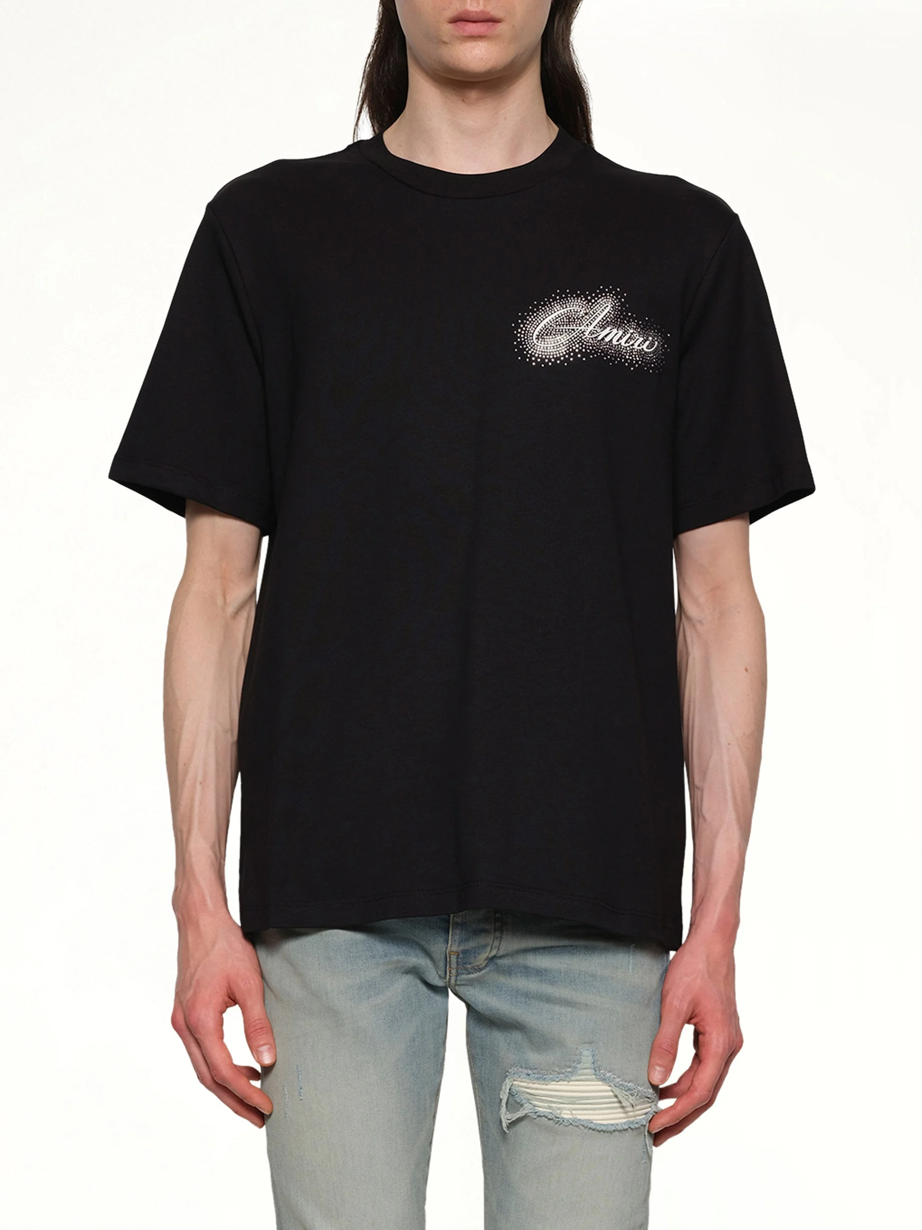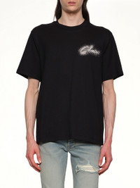 Amiri's Amiri Script Tee in Black is a stylish and versatile addition to any wardrobe. This tee features a bold script logo that adds a touch of modern flair to a classic silhouette. - Composition: 100% COTTON - Color: Black - Features a bold Amiri script logo - Short sleeves - Classic crew neck design - Regular fit - Made in Italy Model is 187 cm and wears size M SKU: AMJYTE1253 001