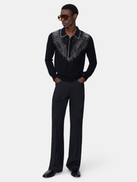 FOR AUTUMN-WINTER 2025, HAND-PLACED BEADS ILLUMINATE KNITWEAR IN A STRIPED GRADIENT EFFECT. THE CRYSTAL LONG SLEEVE POLO IN VIRGIN WOOL FEATURES FINE RIB FINISHES AND CONCEALED BUTTON CLOSURE. AUTUMN-WINTER 2025 COLLECTION MADE IN ITALY 100% VIRGIN WOOL THIS GARMENT HAS UNDERGONE A SPECIAL PROCESS WHICH RESULTS IN INTENTIONAL VARIATIONS OF SHADING AND COLOR, AND ADD TO THE PIECE'S UNIQUE CHARACTERISTICS. THIS MAY LEAD TO BLEEDING OR DYE TRANSFER. PLEASE USE CAUTION WHEN WASHING OR DRY-CLEANING THIS ITEM STYLE:AMKNPO1076-001 SIZE & FIT MODEL MEASUREMENTS: HEIGHT: 6’2.5" CHEST: 35.5" WAIST: 28" HIP: 34.5" PRODUCT MEASUREMENTS (SIZE M): CHEST: 22.2" SHOULDER: 17.72" LENGTH: 27.44" SLEEVE LENGTH: 10"